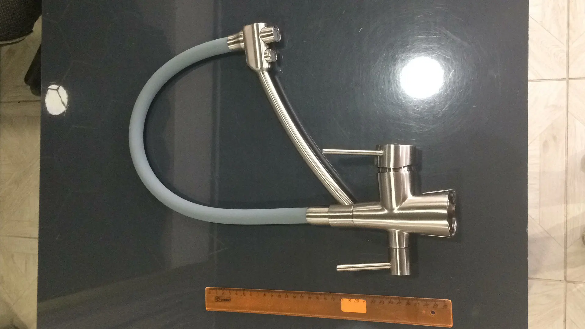 Прекрасный качественный смеситель, из латуни,очень тяжелый. Расстояние между столешницей (бортом мойки) и навесным шкафом должно быть не менее 45 - 50 см. В Киев Мист-Экспресс доставил за 1,5 месяца, из них по Китаю посылка каталась месяц. Хороший продавец, уточнил в переписке сразу номер телефона,по сколько начал не корректно отображаться адрес доставки у продавца (какая то проблема на Али) . Вывод - покупайте, не пожалеете.