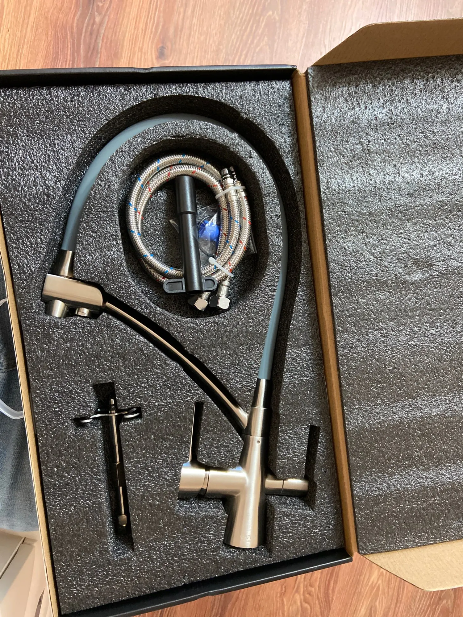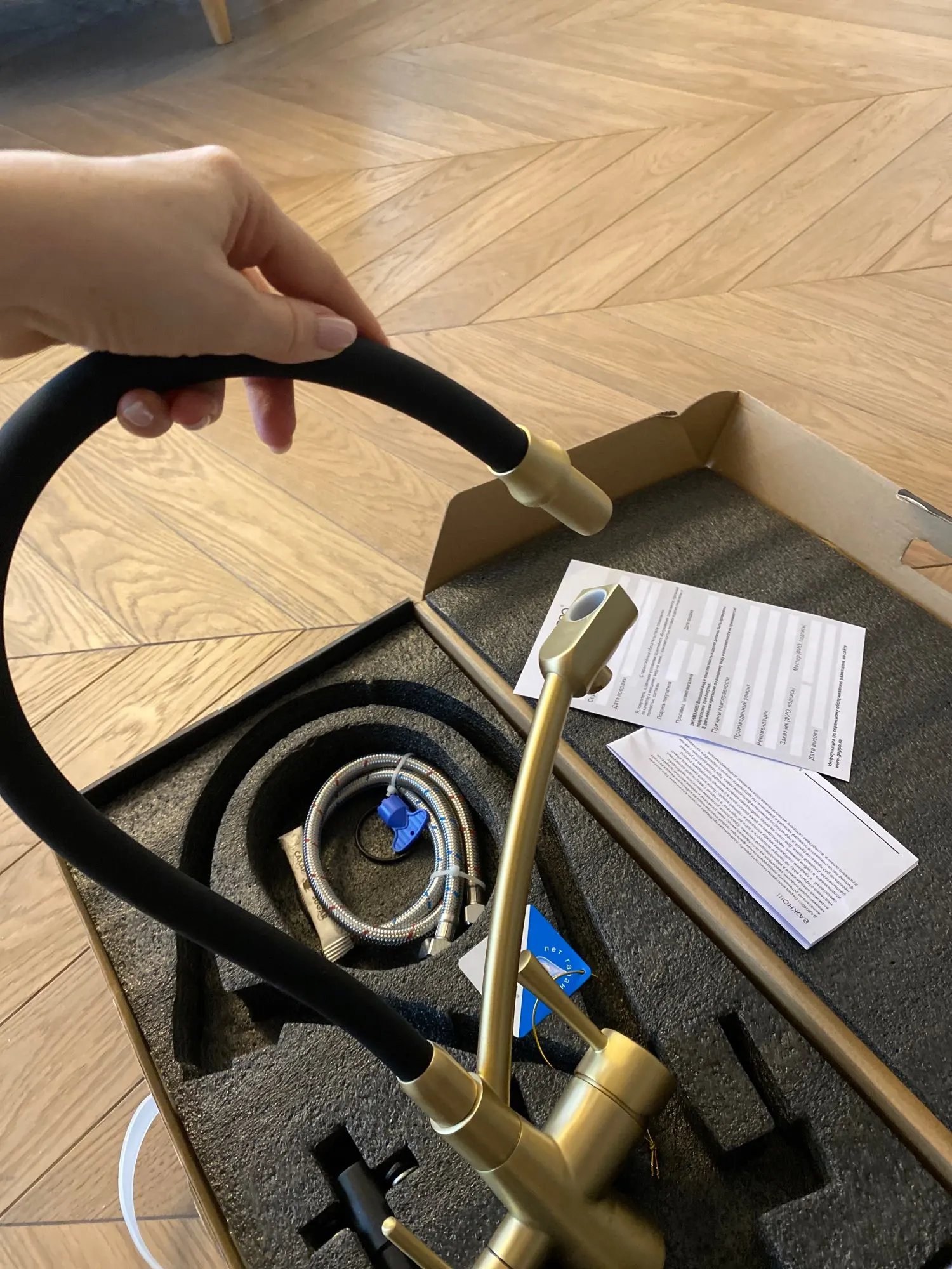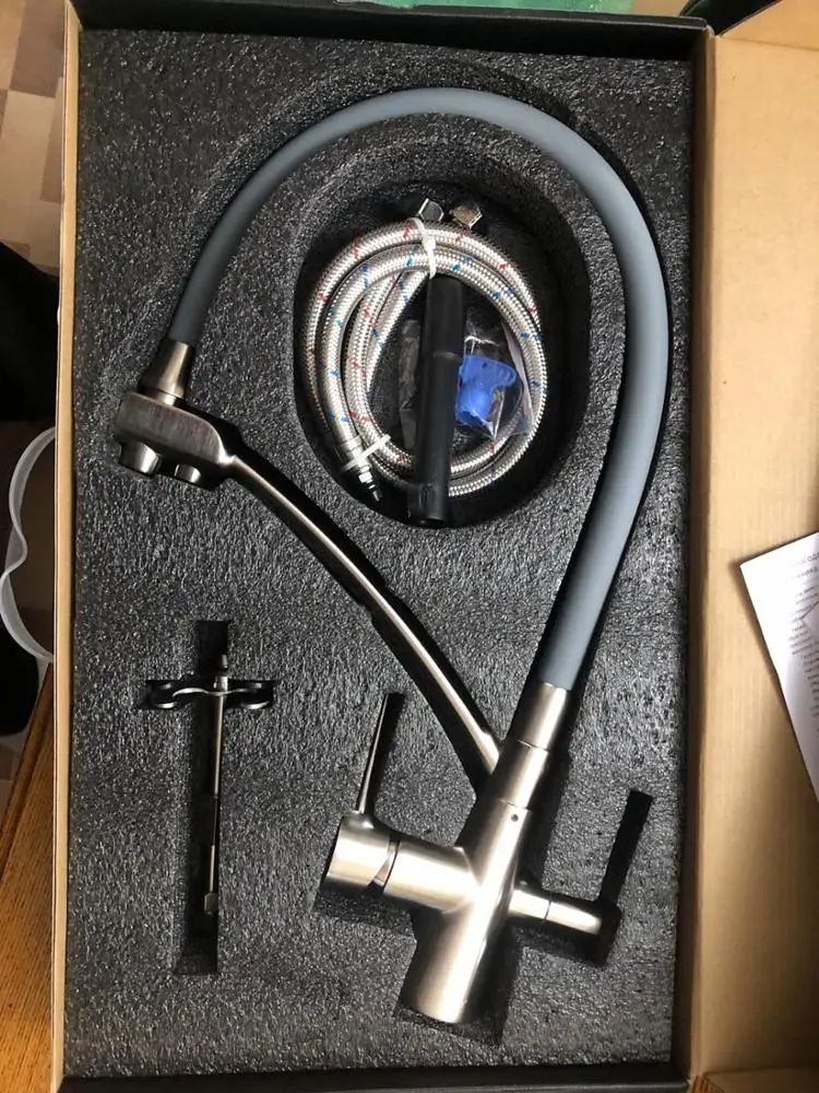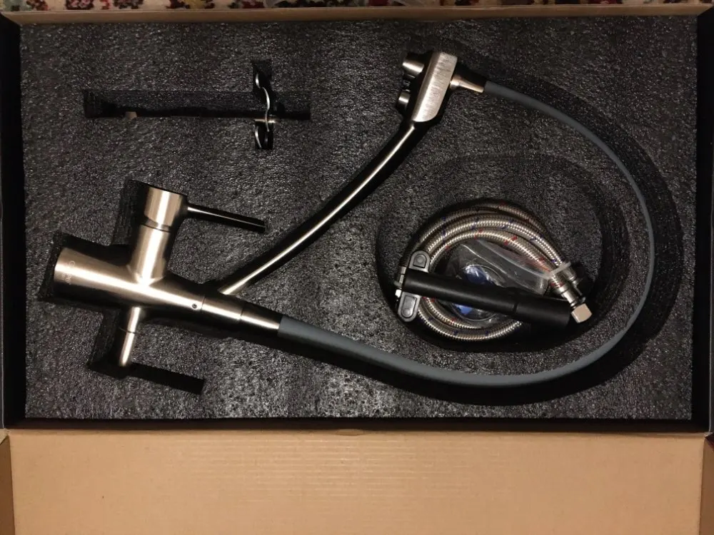 Доставка до Кохмы за 4 дня. Сам кран приехал в хорошей коробке с ручкой. Приятная поверхность, ровный плавных ход вентелей, мягкий и в то же время достаточно жесткий шланг подачи воды. Сама конструкция очень крепкая, видно что качествнная.