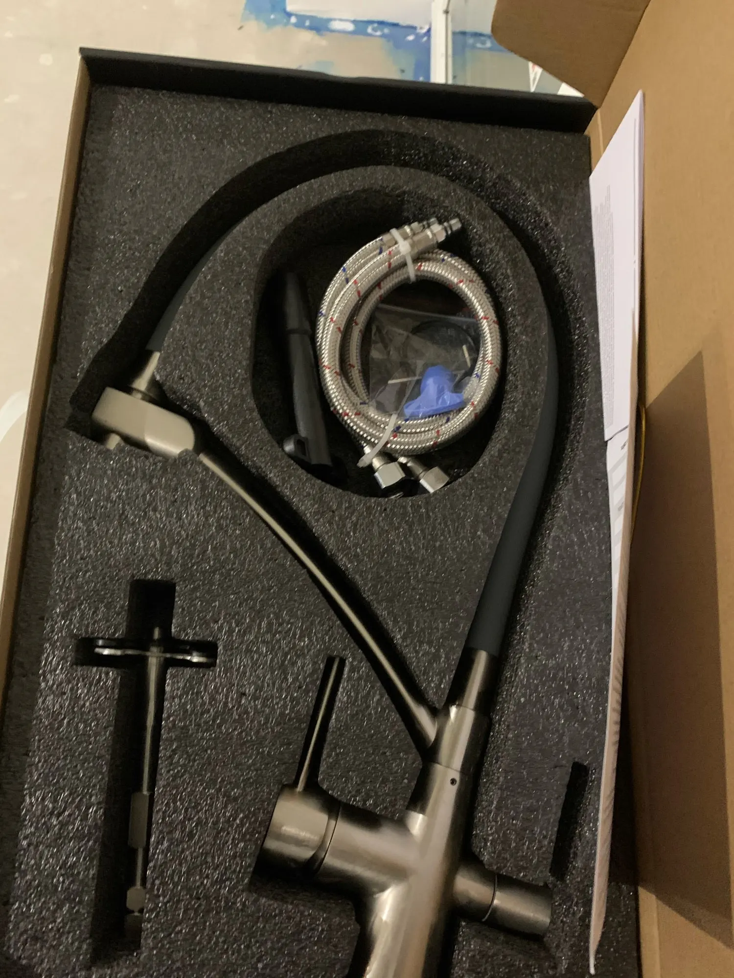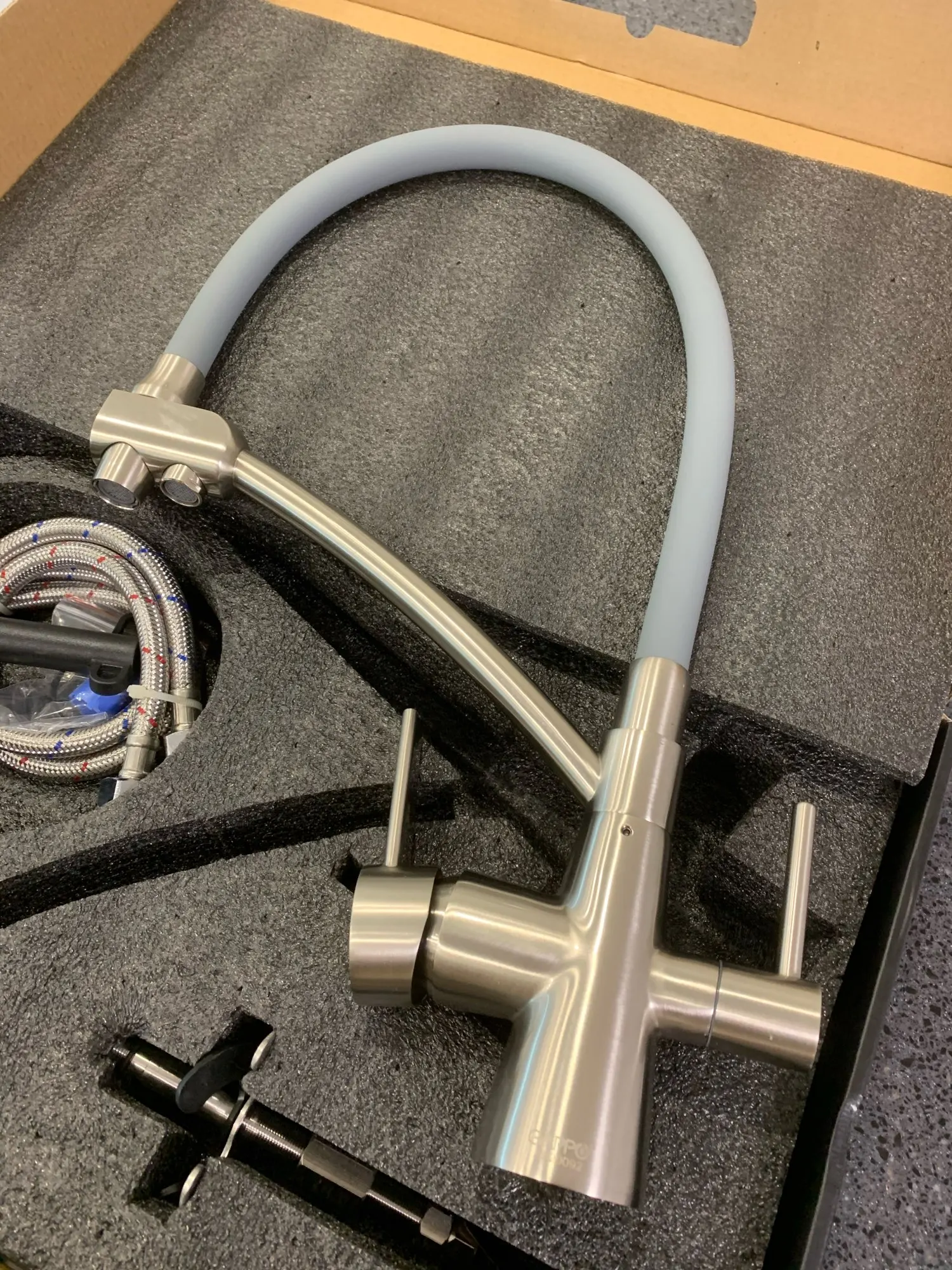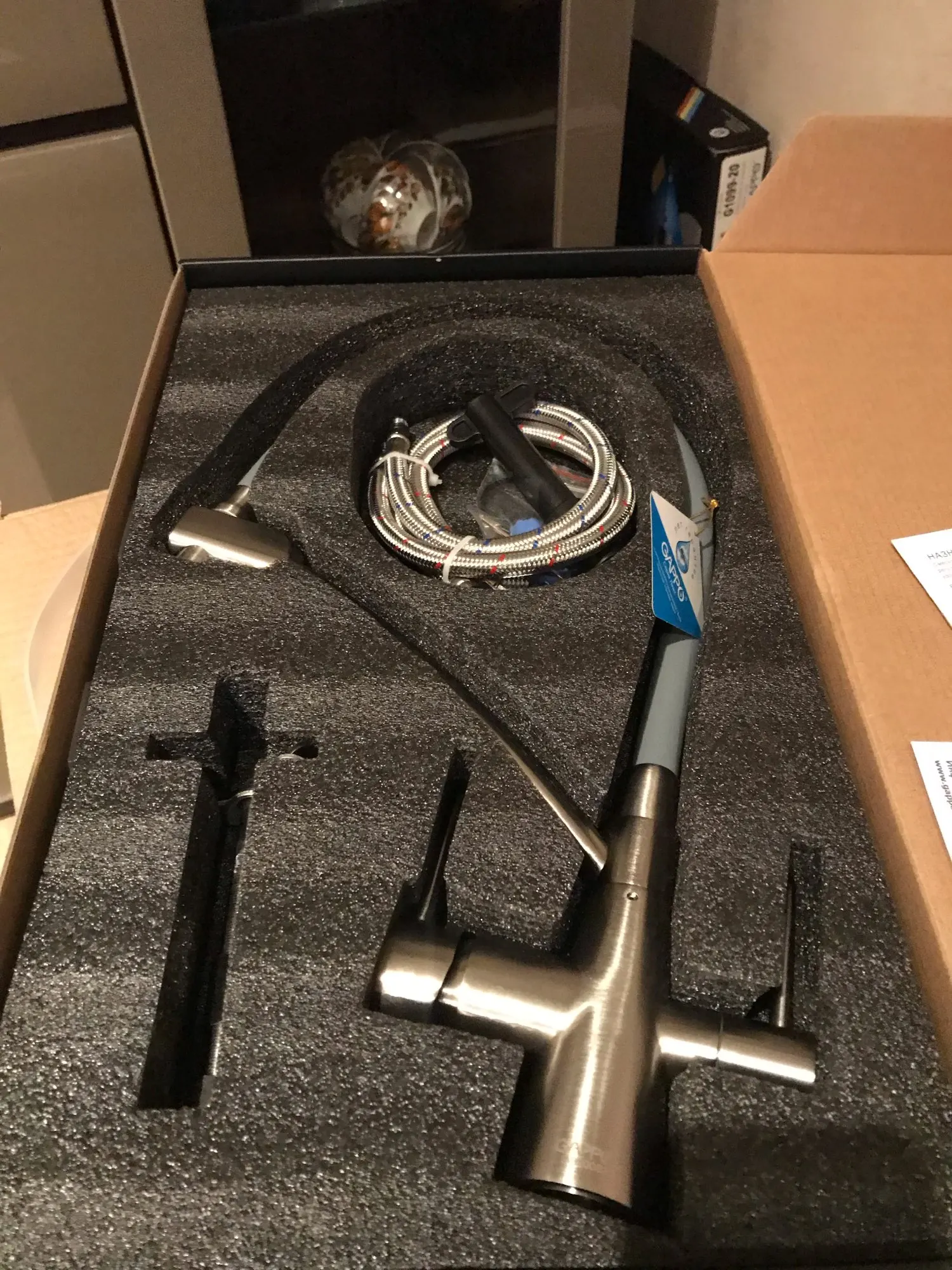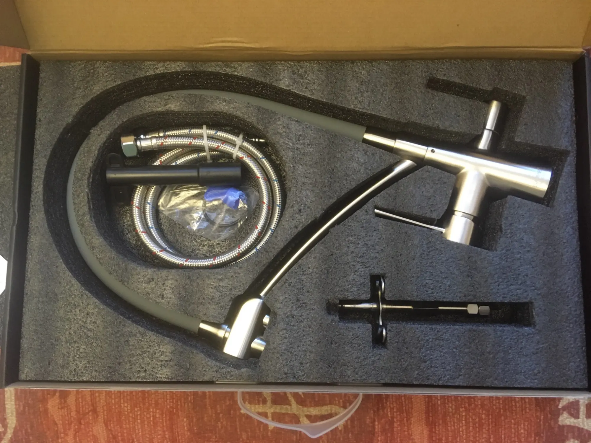 Доставка до Кохмы за 4 дня. Сам кран приехал в хорошей коробке с ручкой. Приятная поверхность, ровный плавных ход вентелей, мягкий и в то же время достаточно жесткий шланг подачи воды. Сама конструкция очень крепкая, видно что качествнная.