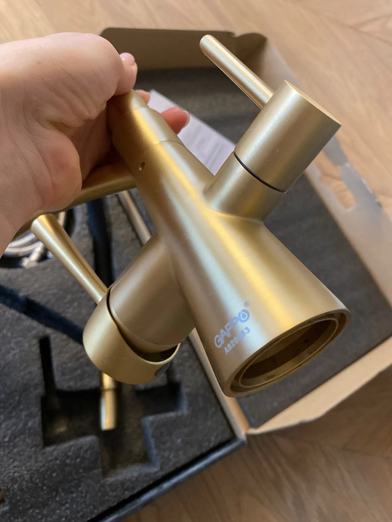 чутка поцарапан носик, который вставляется в дырочку, при чем царапины в нехарактерном месте, но это не критично на мой взгляд. всё равно носик в процессе эксплуатации исцарапается прилично. сам кран топ. у меня вся сантехника в доме гаппо: от кранов в санузлах и жопомойки, до душа с грибком. уровень качества на мой взгляд сопоставим с одной компанией на букву G