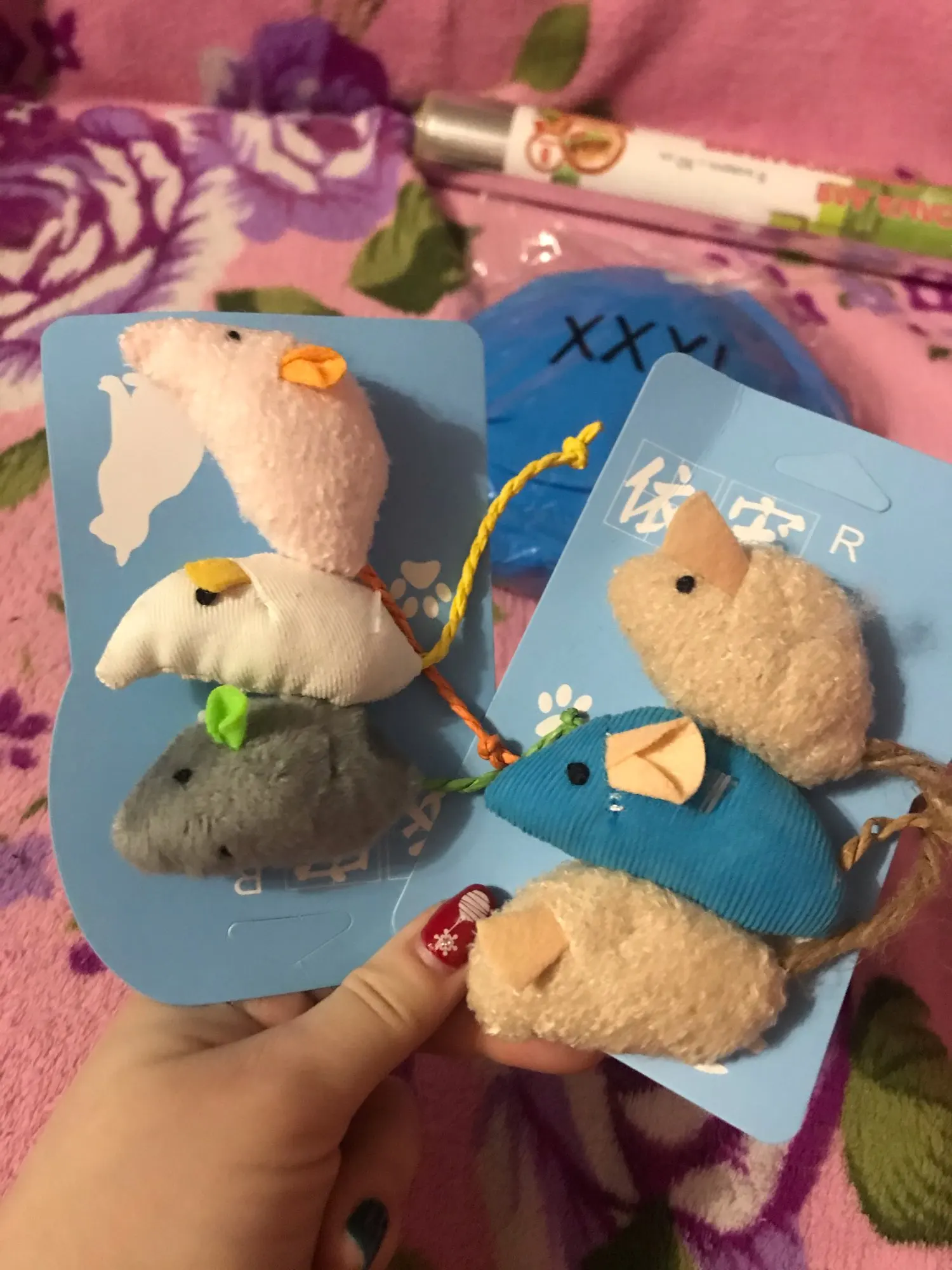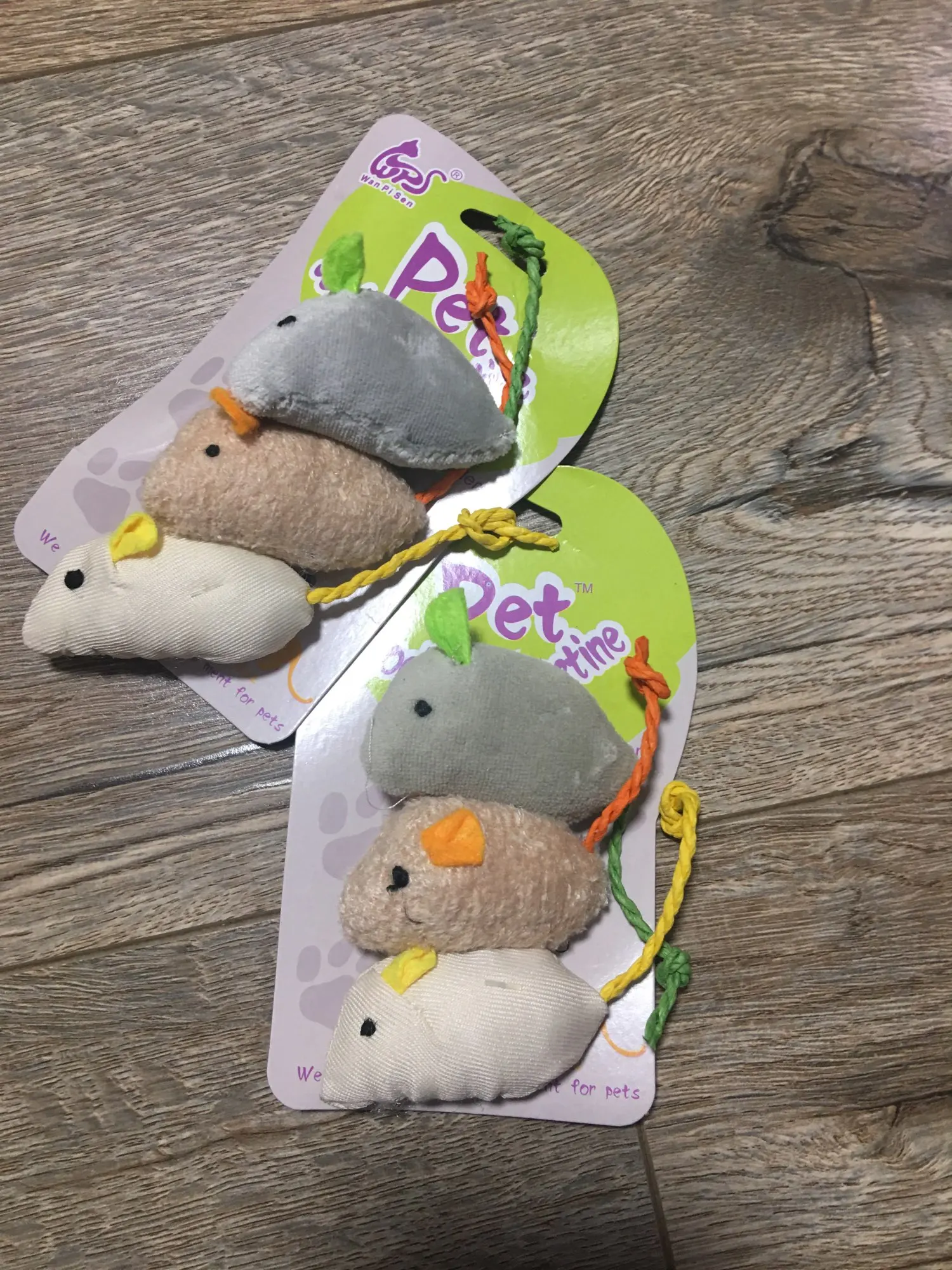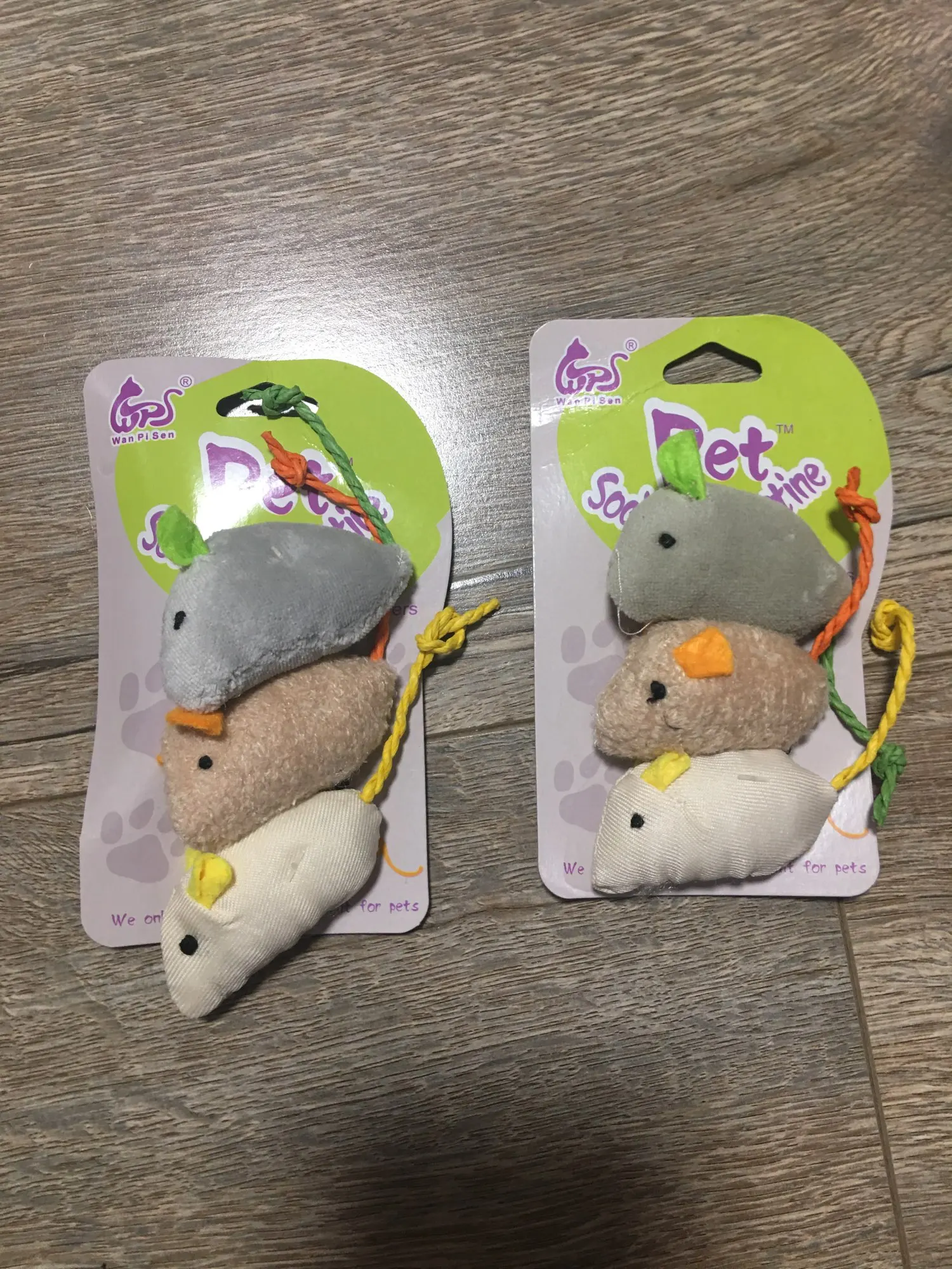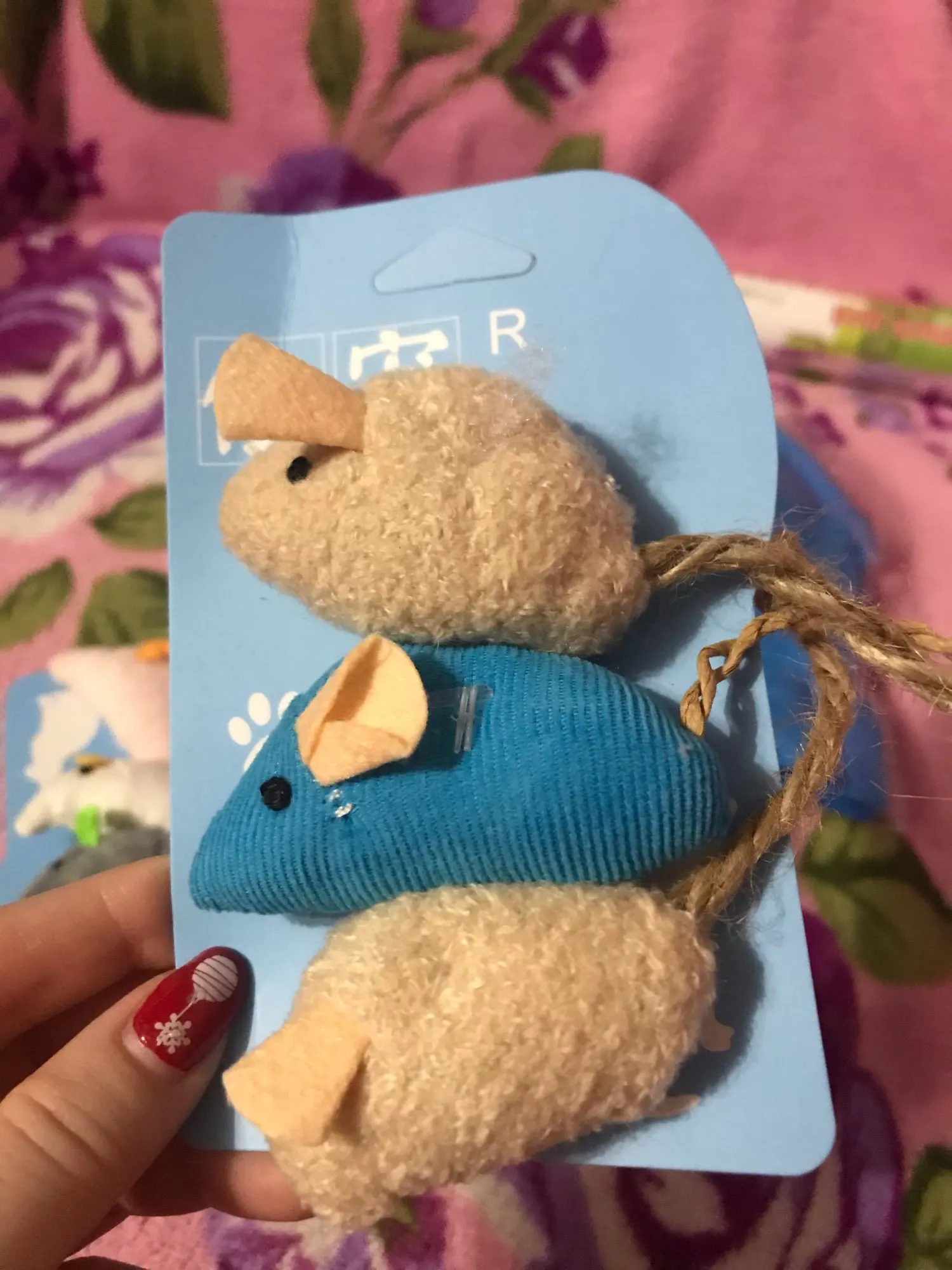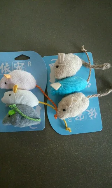 Потребовалось время, чтобы добраться сюда. Они пришли хорошо завернутыми. Мыши типа плюша, без пластикового склада внутри. Глаза сделаны из нитей. Это деталь, которая мне очень понравилась, потому что с другими, в которых глаза и нос сделаны шариками, я всегда боюсь, что они проглотить или привлекать себя. Они, кажется, долговечны. Посмотрим, выживут ли они моей кошке.