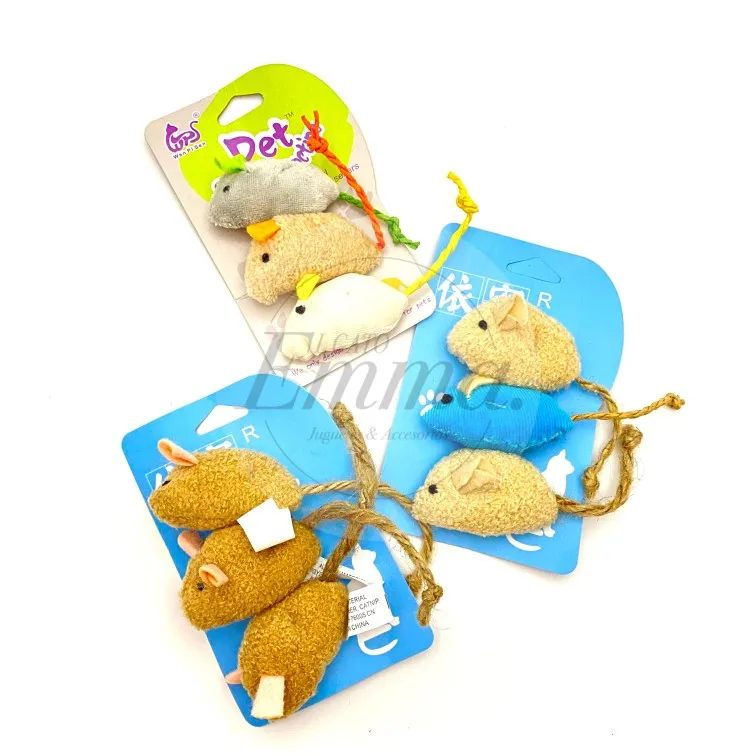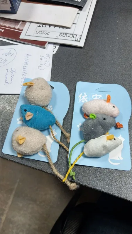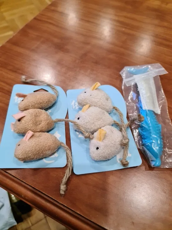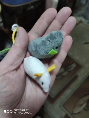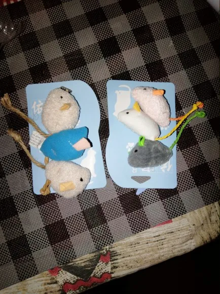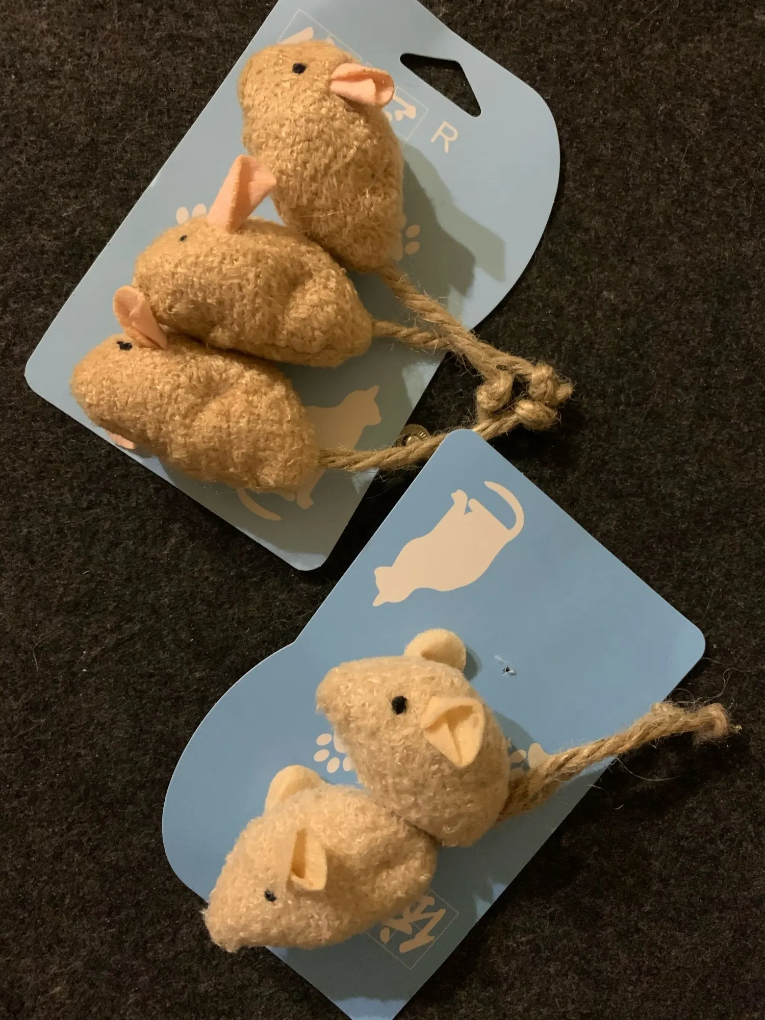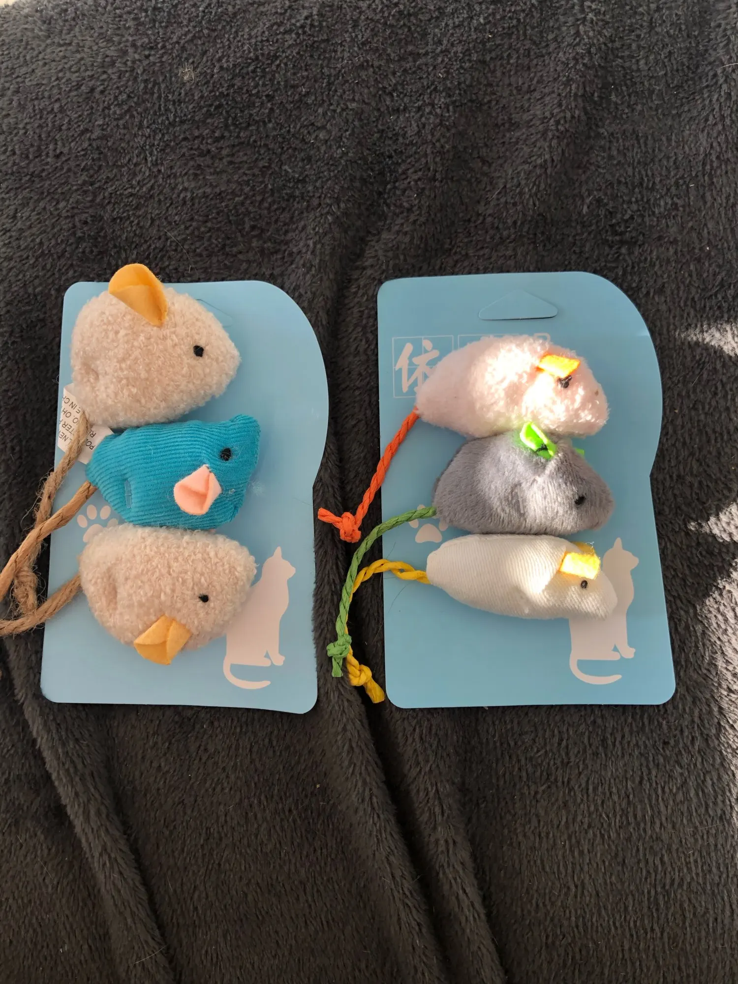 Потребовалось время, чтобы добраться сюда. Они пришли хорошо завернутыми. Мыши типа плюша, без пластикового склада внутри. Глаза сделаны из нитей. Это деталь, которая мне очень понравилась, потому что с другими, в которых глаза и нос сделаны шариками, я всегда боюсь, что они проглотить или привлекать себя. Они, кажется, долговечны. Посмотрим, выживут ли они моей кошке.