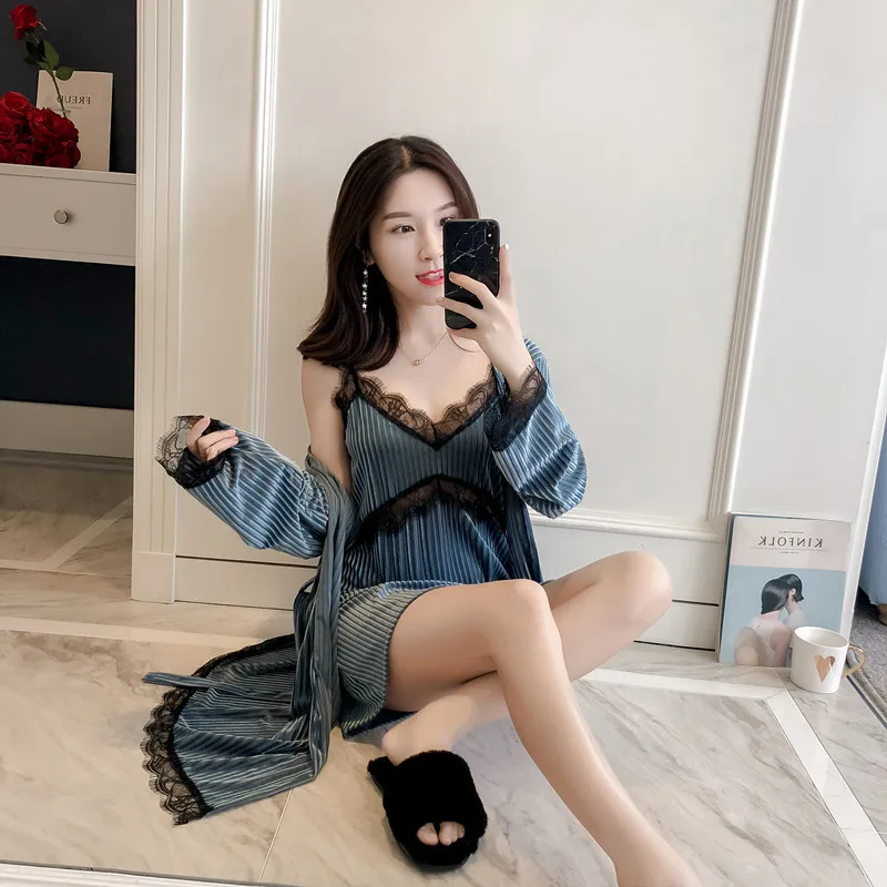 Женский бархатный пижамный комплект JULY'S SONG, из 2 предметов, осенне-зимний кружевной банный Халат