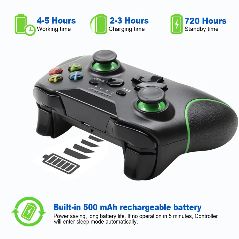 Беспроводной контроллер для Xbox One, ПК, планшетов, смартфонов из магазина WWH Store Пришел контроллер надёжно упакован. Подключается к устройствам благодаря беспроводной передачи 2,4G, обеспечивает стабильное соединение растоянием до 8 метров. В этом контроллере используется высокопроизводительная физическая технология второго поколения, высокопроизводительная лицевая батарея ёмкость 500мА'ч. Заряжается в течении 2 часов. Заряда хватает где-то на 5 часов. Превосходное управления для, игр в любимые игры.