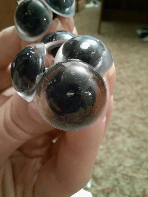 Классные глазки, без сколов и царапин. Идеально подходят игрушкам из плюшевой и фактурной пряжи. А вот на игрушках из полухлопка и хлопка будут ооочень выпуклыми.