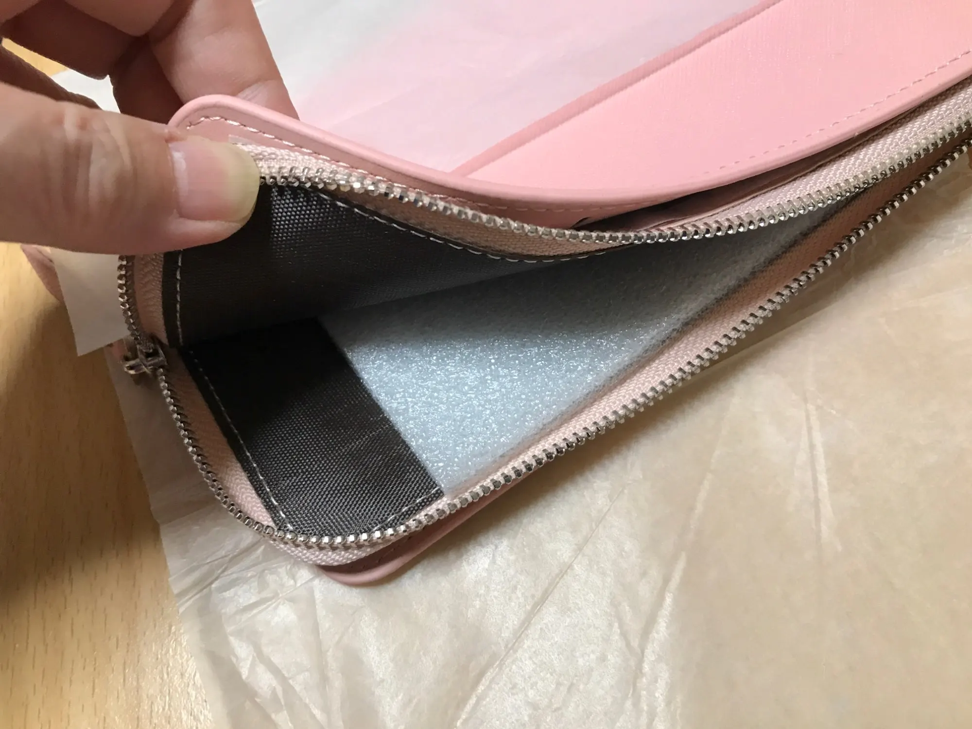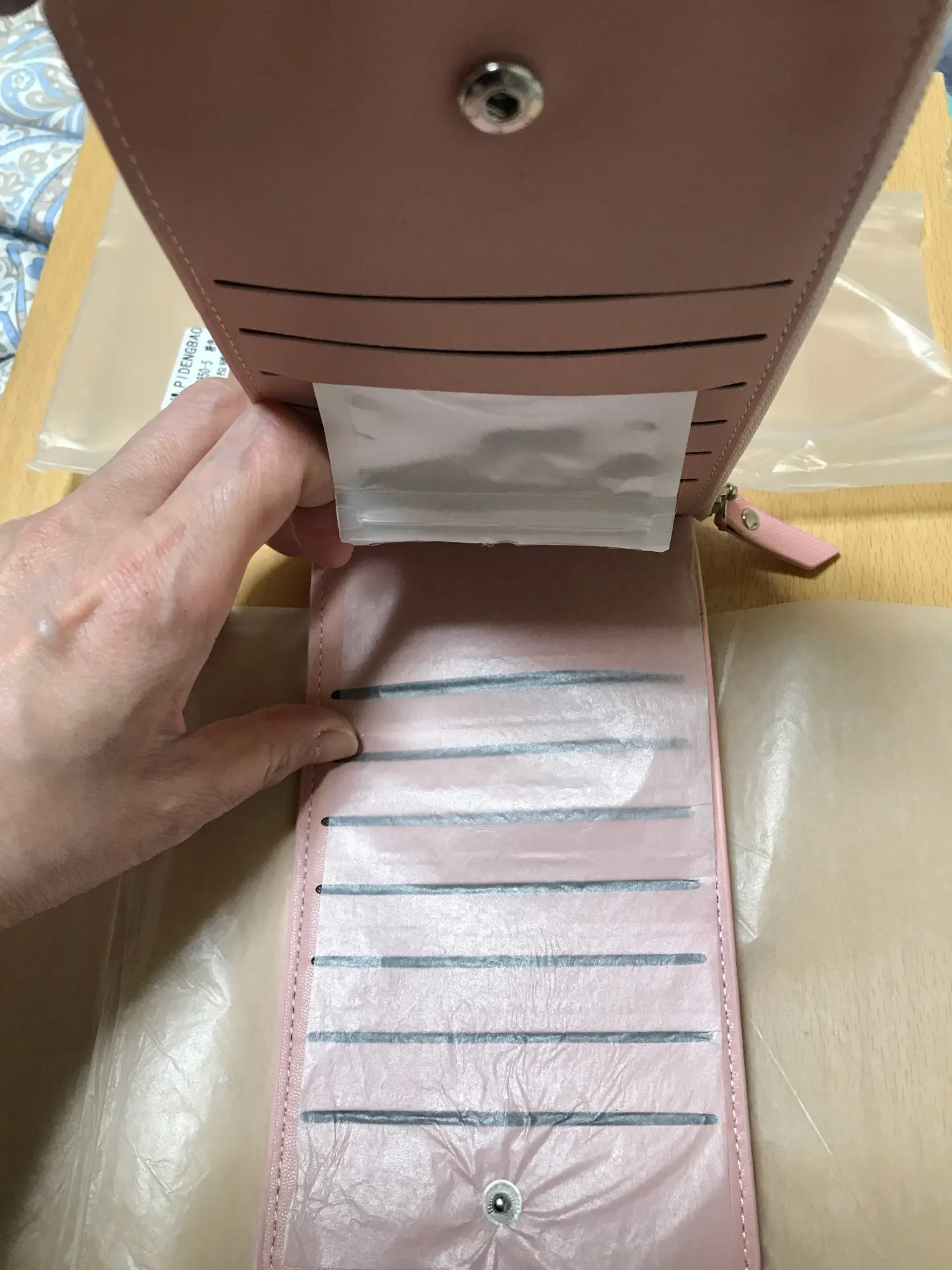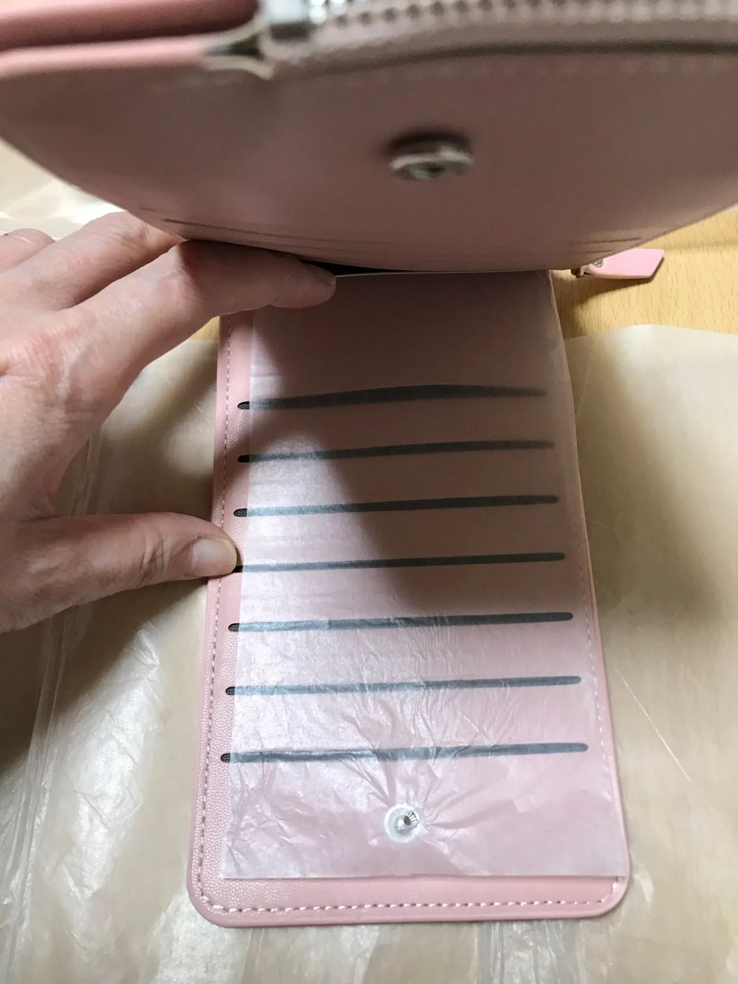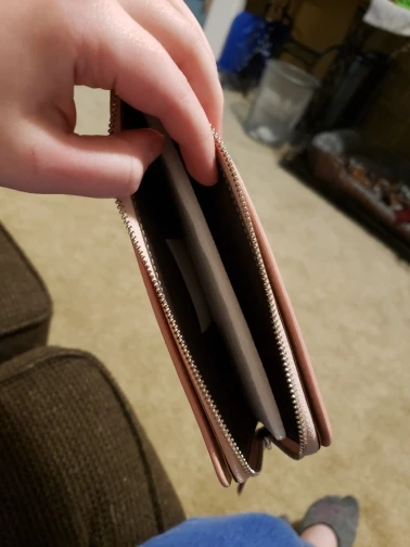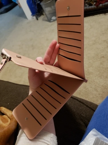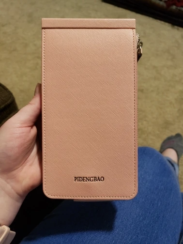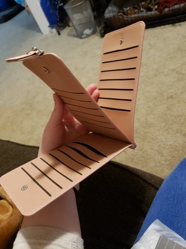 Это интересный кошелек. Мне нравится, что есть так много карманов, и карман на молнии достаточно велик, чтобы держать Galaxy Note 9. Мои фотографии не делают цвет по-другому. Это действительно красивый балетный розовый цвет, который больше нравится изображению товара.