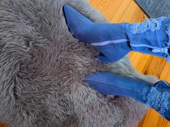 Женские ботинки; Большие размеры 34-43; Эластичные джинсовые ботильоны с острым носком; Обувь на высоком толстом каблуке; Женские носки