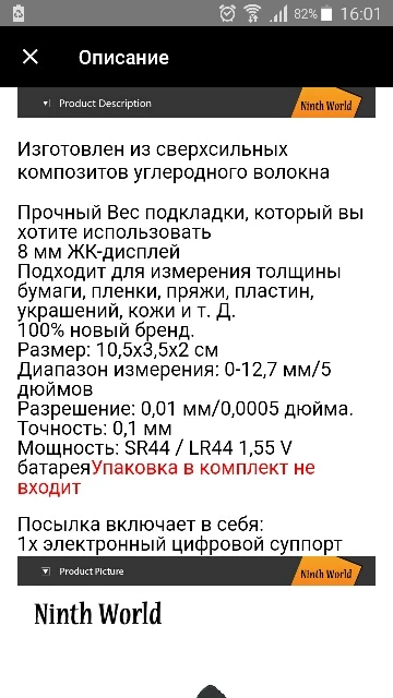 доставка за 35 дней микрометр хороший упаковано очень хорошо Он работает продавец прекрасный поставил цену ниже фактической По моей просьбе единственная мелочь в описании на сайте размер батарейки указан не тот sr44 гораздо толще нежели требуется но это не вина продавца А так всё прекрасно Могу рекомендовать