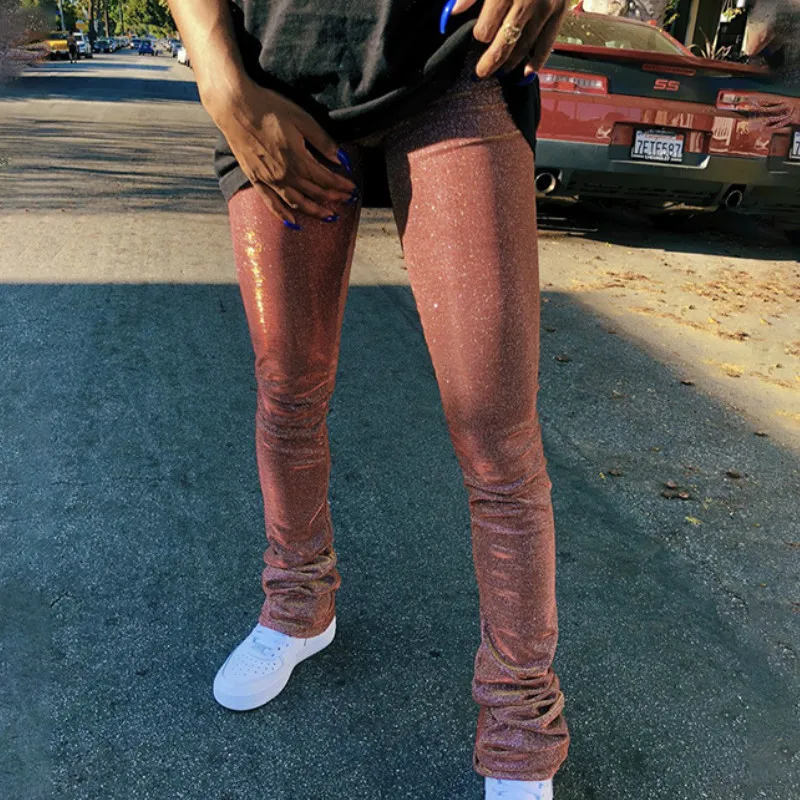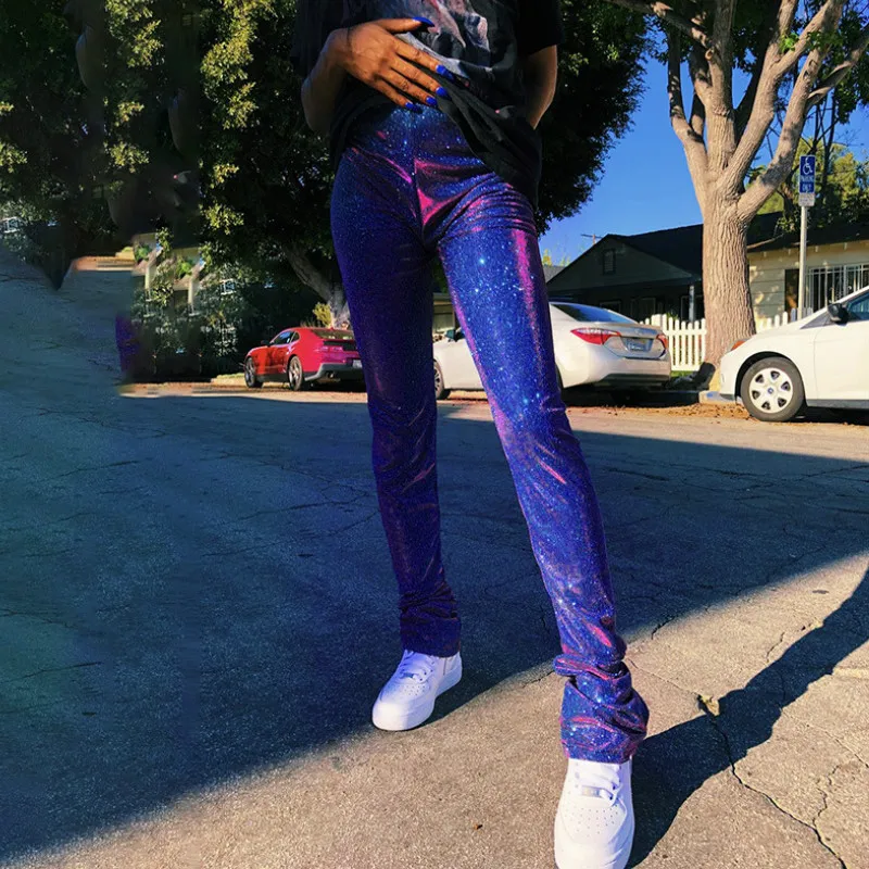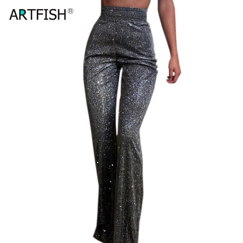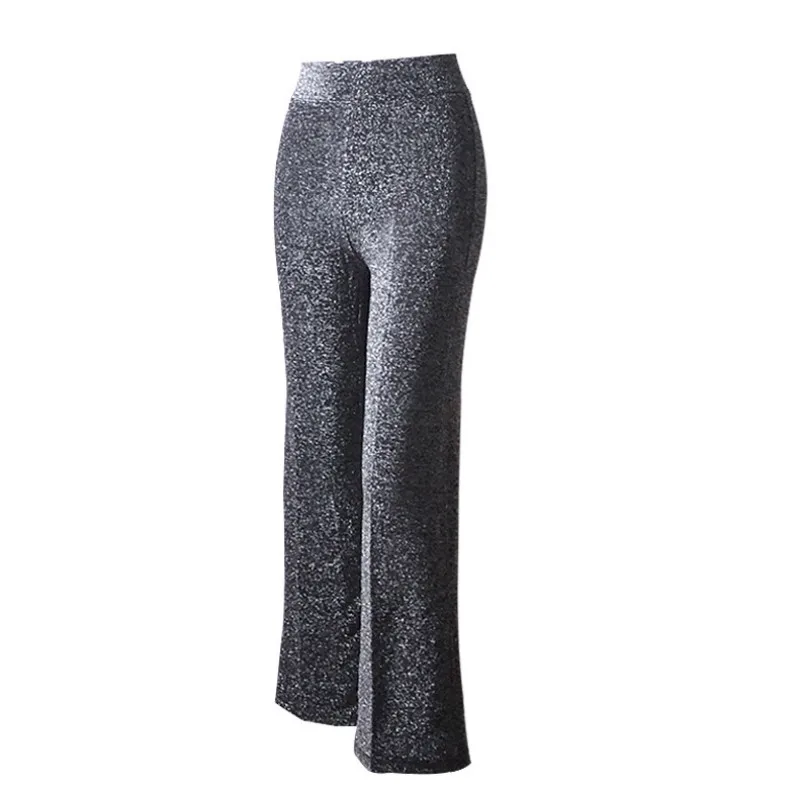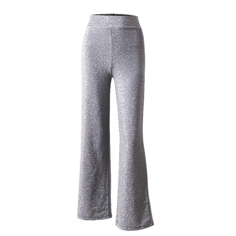 Сексуальные блестящие брюки, женские расклешенные брюки с высокой талией, светоотражающие широкие брюки на молнии, Серебристые Длинные брюки Mujer M0265