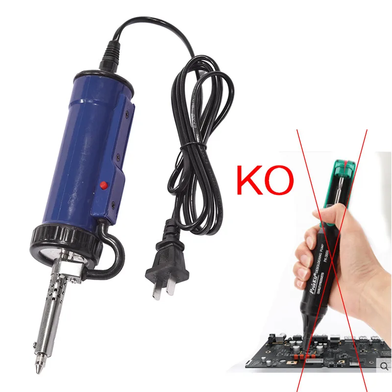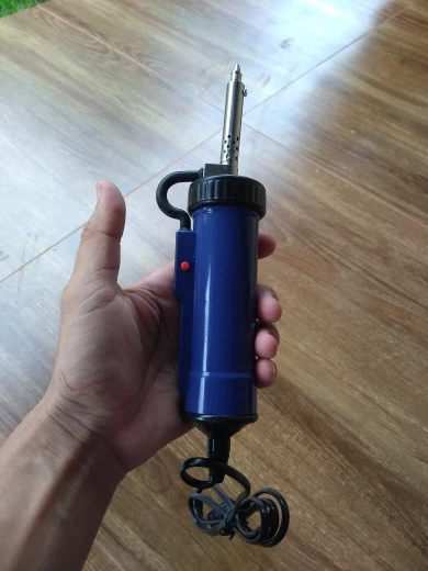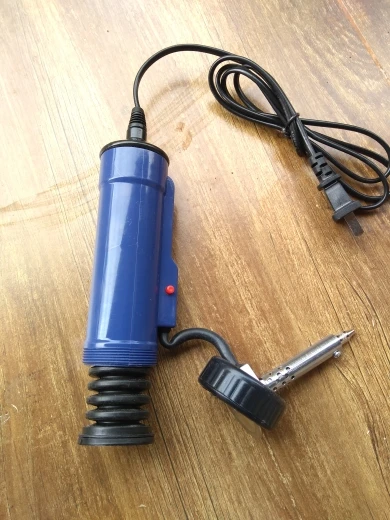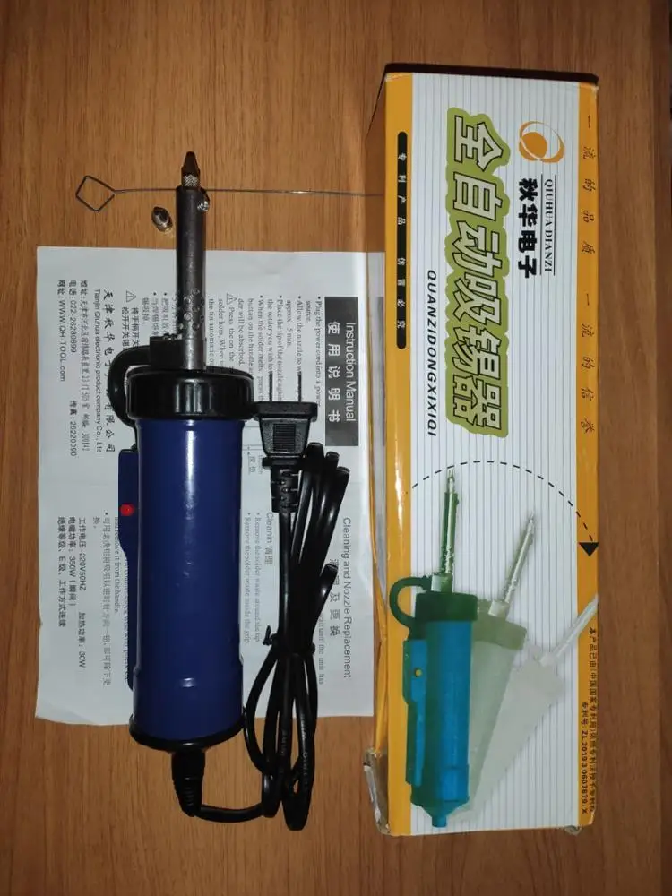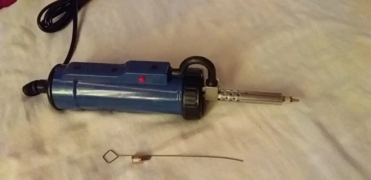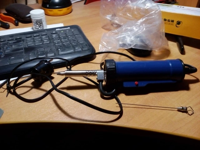 Паяльник рабочий. Провод в крышке держится плохо- слабенький фиксатор, но это мелочь. Олово втягивает отлично. При нажатии на кнопку- всасывает, а при отпускании - выплёвывает, так что держите под рукой ёмкость куда будете сплёвывать:))
