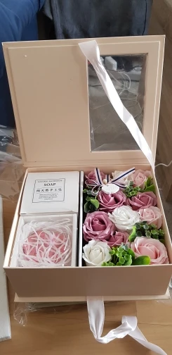 Хотя коробка прибыла хорошо защищена, бумага, которая разделяет ее пополам, сломана. И цвет больше как кремовый, а не розовый. Но приятно пахнет, и это прекрасный подарок.