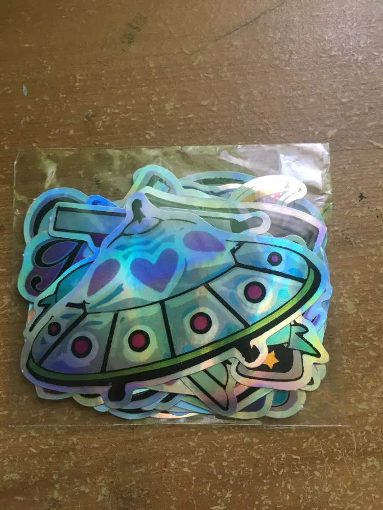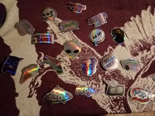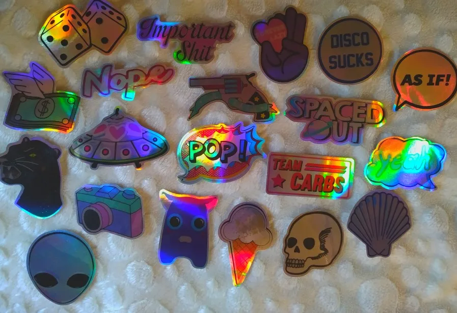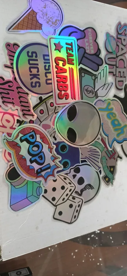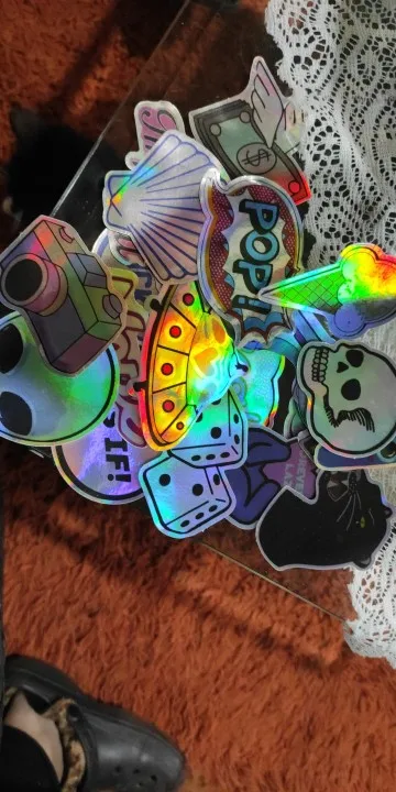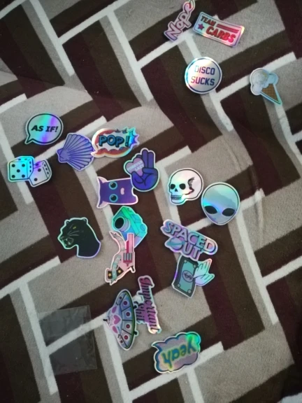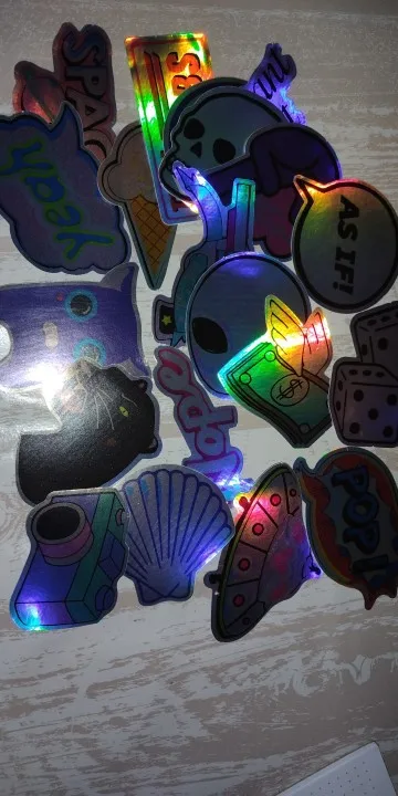 Мне очень понравились эти наклейки! Всё в точности, как в описании. Их много, 20 штук и они разного размера, красиво переливаются, ничего не повторяется. Товар пришел в Алматы течении 2-3 недель, упакованный вместе с другими заказами в одну большую посылку. Они отлично подходят для того чтобы приклеить на ноутбук, скетчбук и т.д. Я всем довольна. Спасибо продавцу!