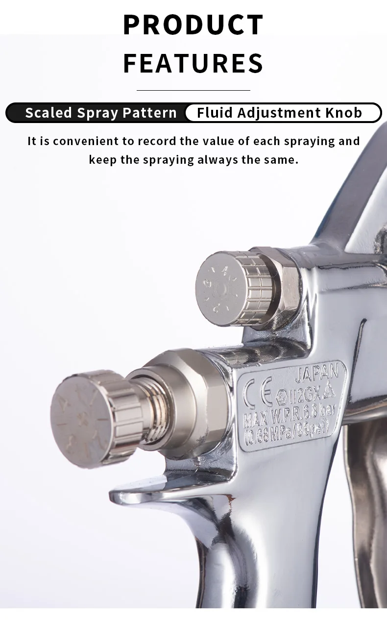 Все модели, расстояние распыления 200 мм.Вязкость 20 секунд/NK-2, отметьте 12 секунд/NK-2.Все модели, коннектор для краски G 1/4 Air connection G 1/4.Размер насадки: 0,8/1,0/1,3/1,5/1,8 ммРазмер распылителя: около 30 смСпрей давление воздуха: 3,0 до 4,0 бар
