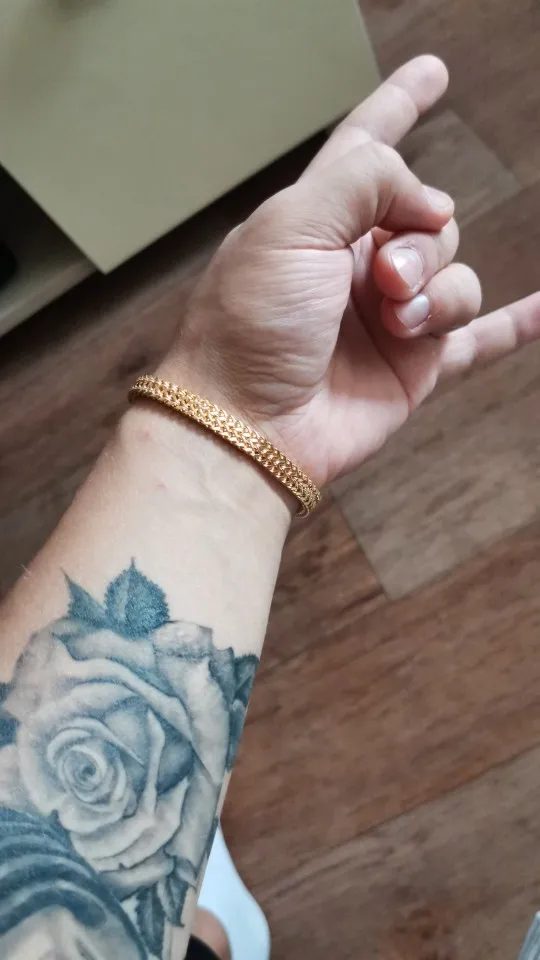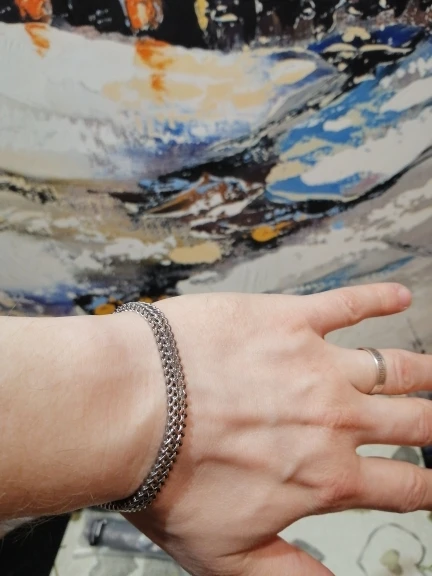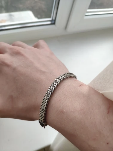 Отличное плетение, есть ощущение, что он может со временем потемнеть, но наговаривать не стану, поношу и потом дополню отзыв. Внешним видом очень довольна, на женской руке сидит свободно, чуть спадая вниз. Такой и искала