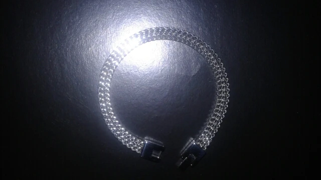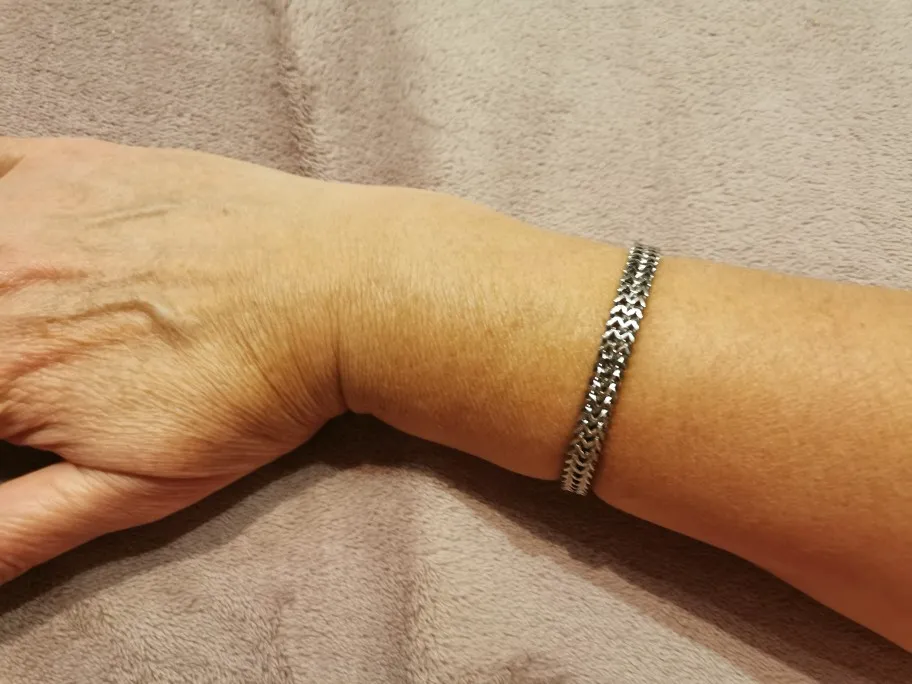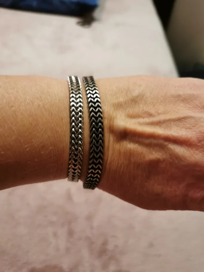 Заказывала 2 браслета, серебристый 19см и с чернением 21см. Браслеты качественные. На моё запястье 17 см тот что 19 нормально подошёл, зазор есть, но я считаю браслет не должен впритык быть. На серебристом застежка очень плотно защелкивается, а на черненном немного свободнее, боюсь, что может расстегнуться. А в целом качество очень хорошее. Отправлено быстро, пришло почтой за 3 недели в Новосибирск.