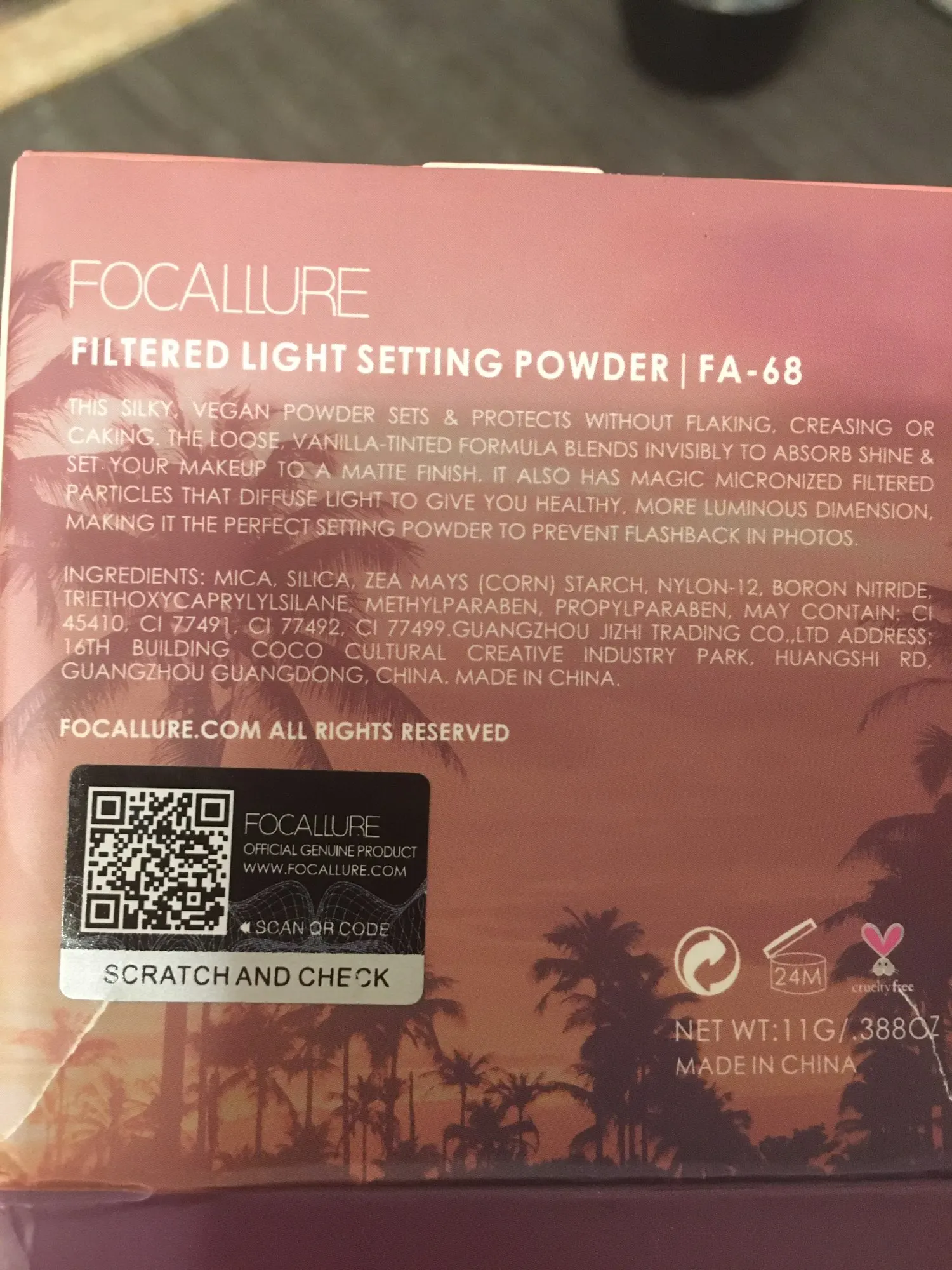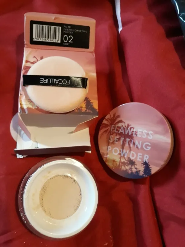 Мой Focallure свободный порошок прибыл быстро. Отличная прочная упаковка. Ничего не сломалось .. Продукт выглядит так сексуально в маленьком блюде. Я пользовался им несколько раз очень доволен. Мне нравится, что он такой легкий и пушистый.. Идет на очень гладкий материал высшего качества .. Это потрясающая свободная пудра цвета слоновой кости .. Красивый макияж... большое спасибо.