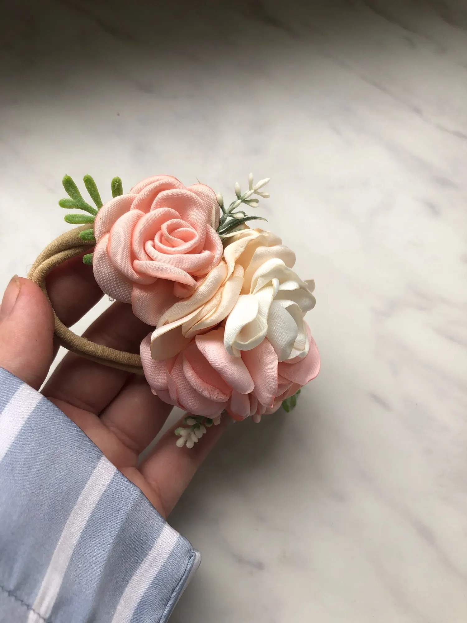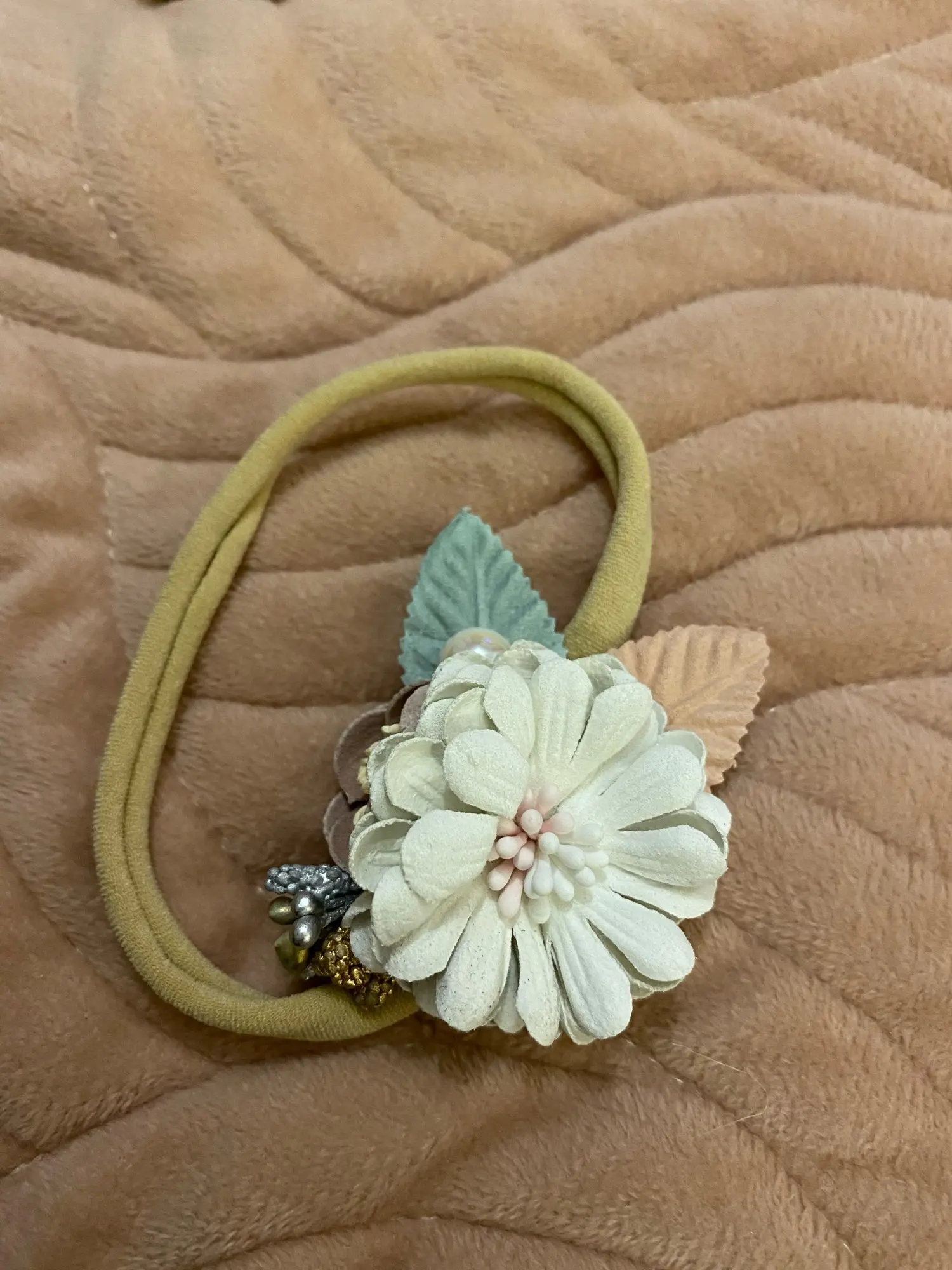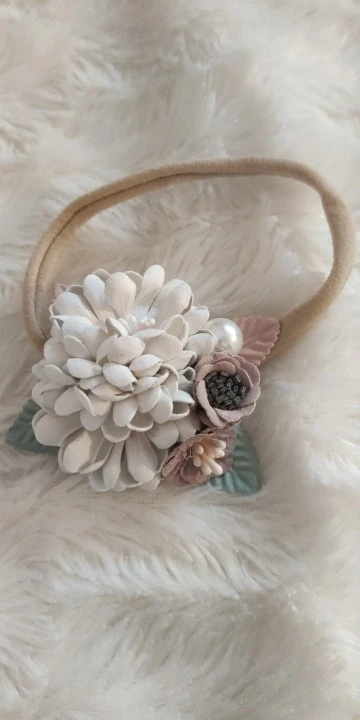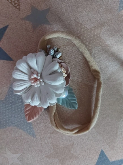 как на картинке, мягкаярезинка телесного цвета, отлично тянется и не давит, украшение как заказывала, цветочки аккуратные, нежные, приятно смотреть и трогать. на головке доченьки смотрится отлично.