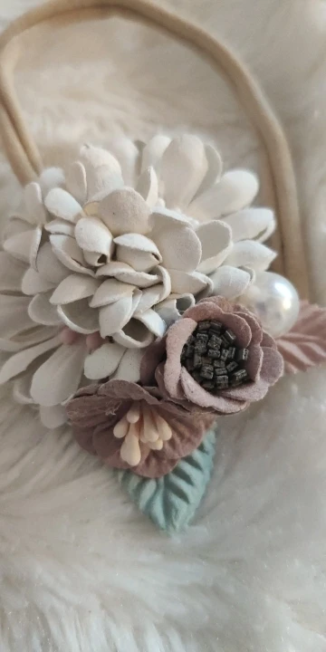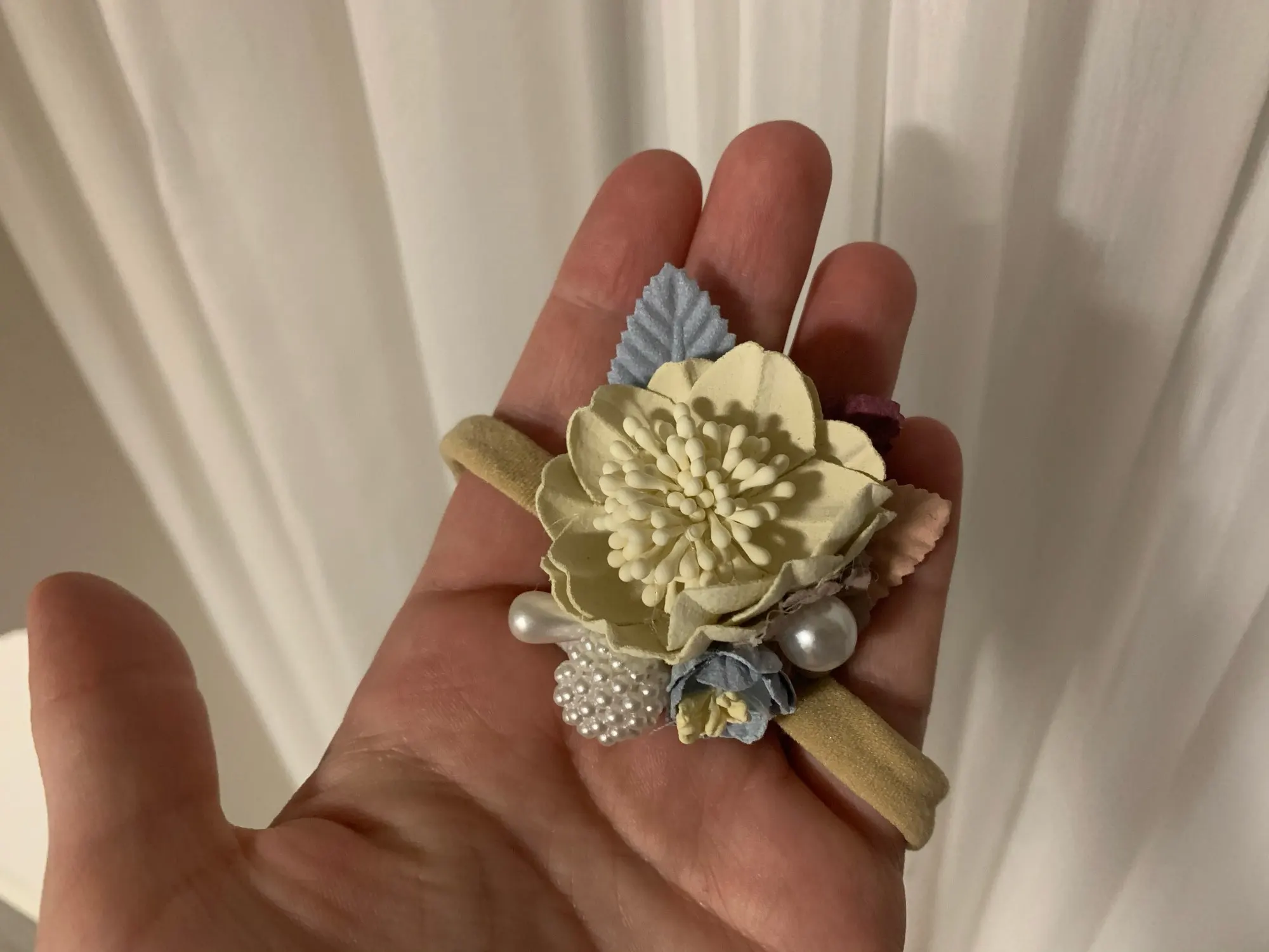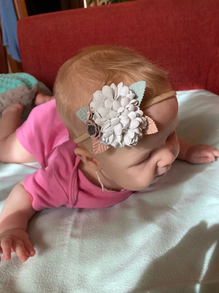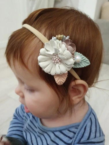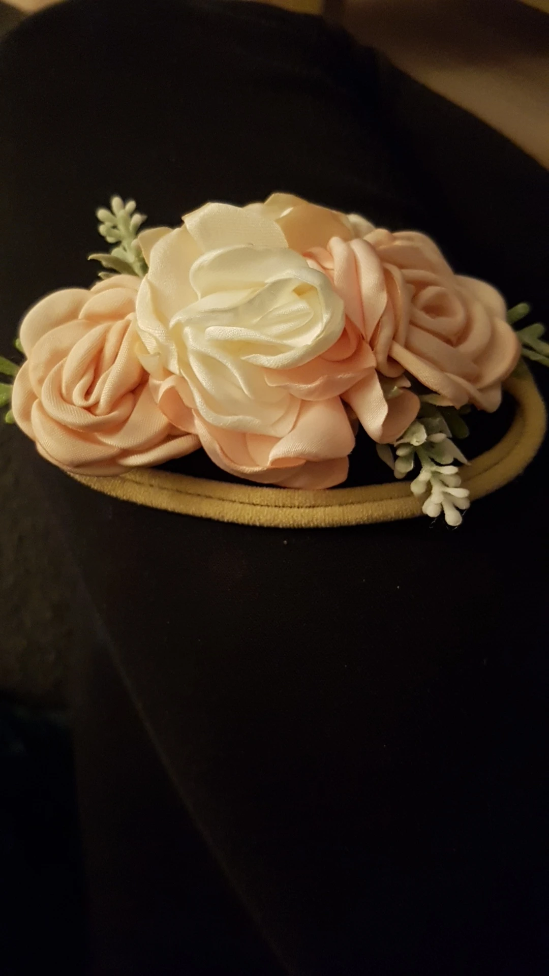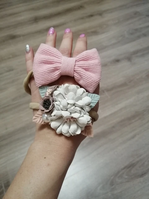 Довольно но маленькая повязочка, хорошо на новорождённого ребёнка и старше тоже. Очень мягкая резинка, которая шикарно тянется. Сами цветы очень плотные, твёрдые. На 4-месячной дочке очень хорошо смотрятся обе повязки, но чуть не хватает скругления на головку, уголки цветов повисают с воздухе, потому что не прилегают.