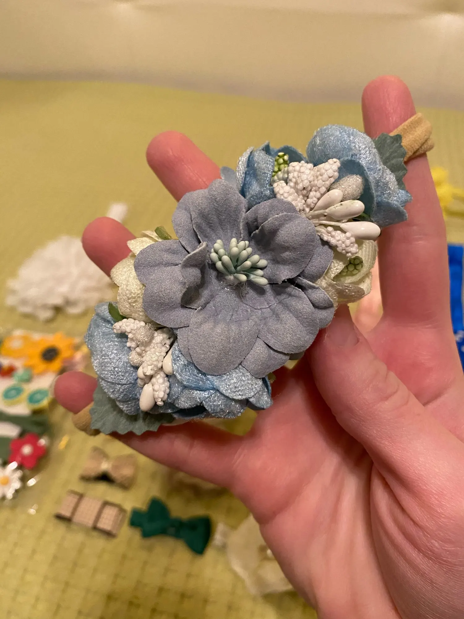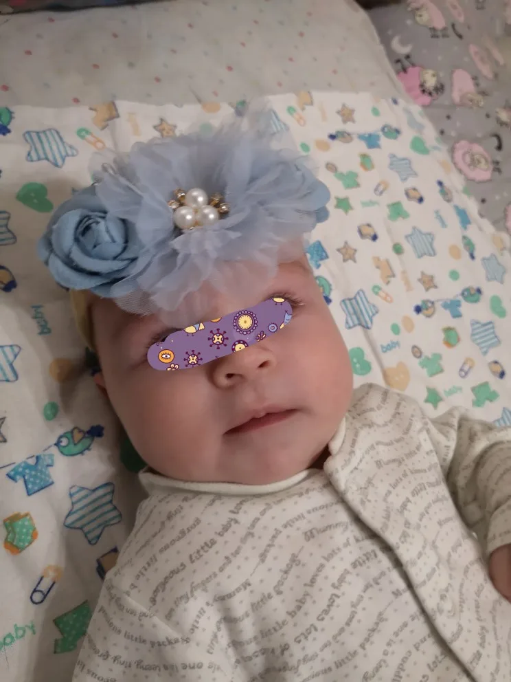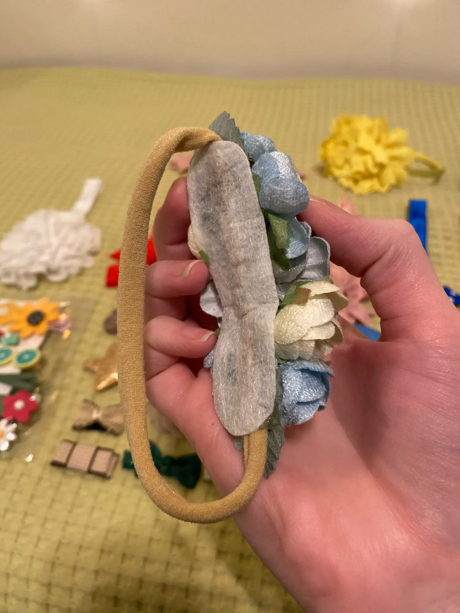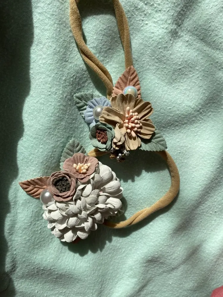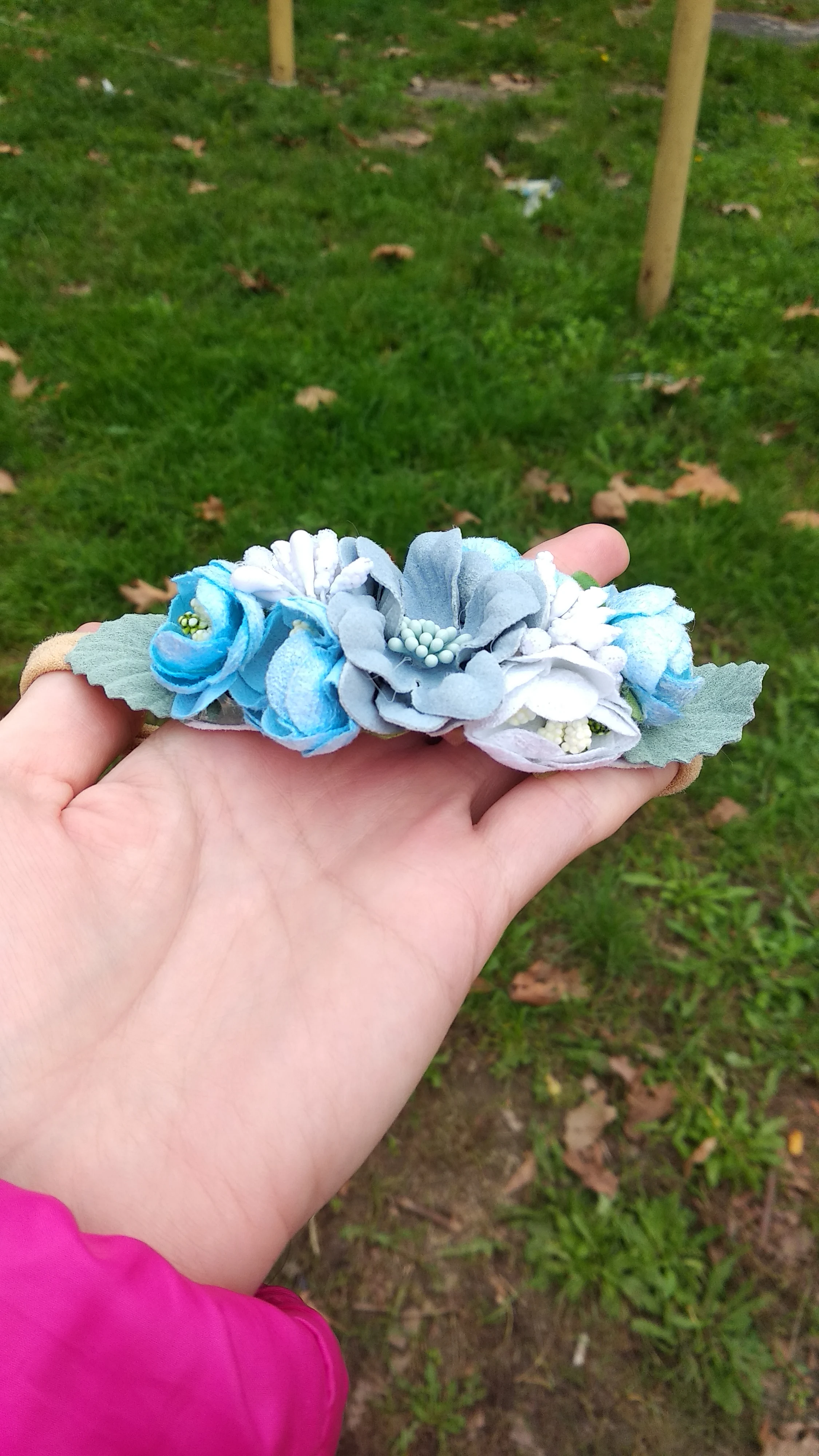 Довольно но маленькая повязочка, хорошо на новорождённого ребёнка и старше тоже. Очень мягкая резинка, которая шикарно тянется. Сами цветы очень плотные, твёрдые. На 4-месячной дочке очень хорошо смотрятся обе повязки, но чуть не хватает скругления на головку, уголки цветов повисают с воздухе, потому что не прилегают.
