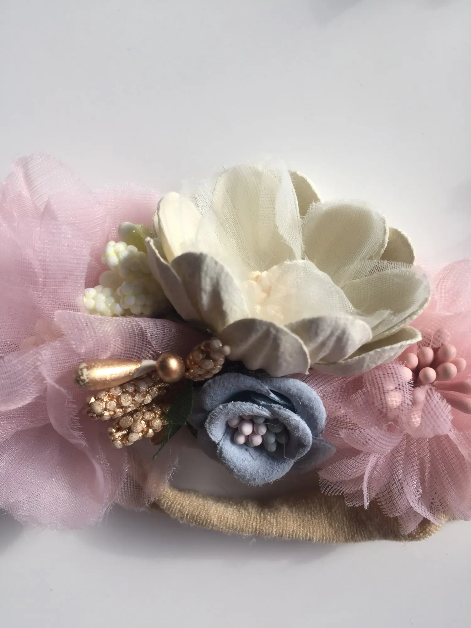 Повязка на голову детская эластичная с жемчужинами и цветами