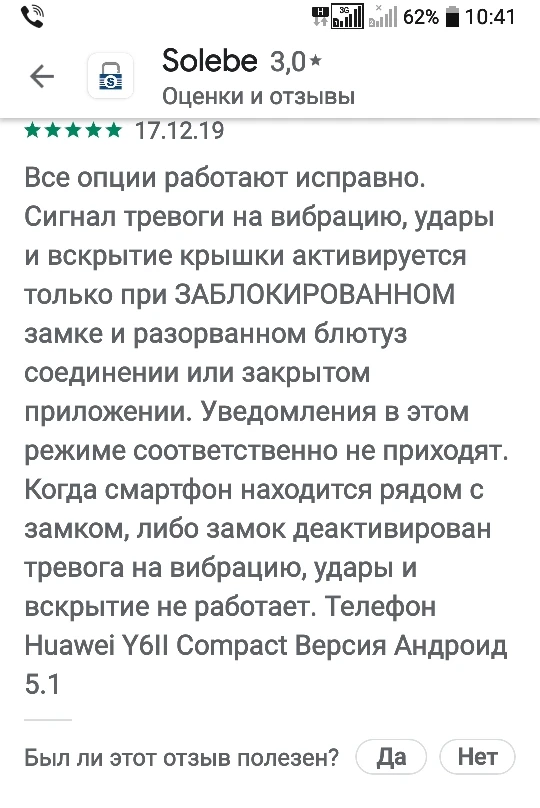 Посылка пришла за 51 день.Упаковка обычная.Замок крепкий.Подключается к телефону быстро.При первом подключении нужно ввести пароль(есть в инструкции).Потом его желательно изменить,чтобы никто не смог подключиться к замку.Найти приложение через поиск в play market у меня не получилось(название брал со скриншота продавца в описании,хотел посмотреть какое оно,еще до покупки)Смог скачать только отсканировав qr-код из инструкции.Приложение простое на английском языке.Но есть одно большое НО! Я хотел,чтобы замок присылал уведомления,когда с ним что-то делают(пытаются открыть, трясут, режут).Соответственно когда он находится в зоне действия bluetooth и подключен к телефону.Специально спросил у продавца перед покупкой,он сказал,что да замок уведомления присылает если что.Но на деле замок уведомления не присылает,когда подключен к телефону.Ниже прикреплю скриншот отзыва с play market, там человек пишет про уведомления.Если бы я увидел раньше этот отзыв,не купил бы.