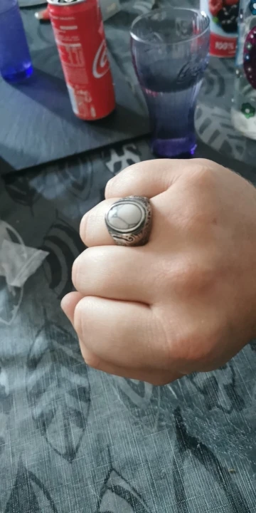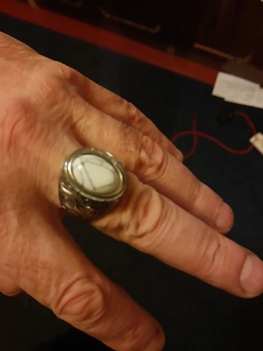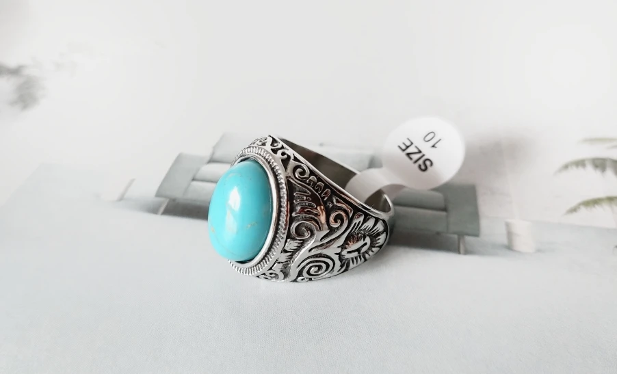 Очень красивое бирюзовое кольцо, которое имеет определенные инкрустированные линии. Серебряный корпус этого кольца украшен гравировкой по всему миру. Кольцо на моем пальце намного больше, но, по всей видимости, размер правильный, и оно хорошо сидит на моем пальце. Этот товар прибыл в хорошее время и хорошо упакован.