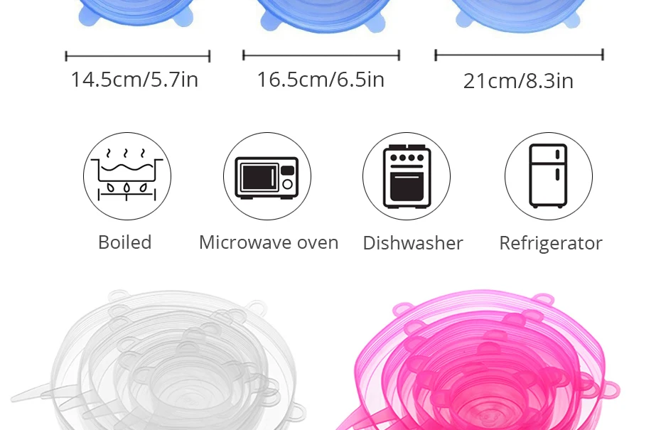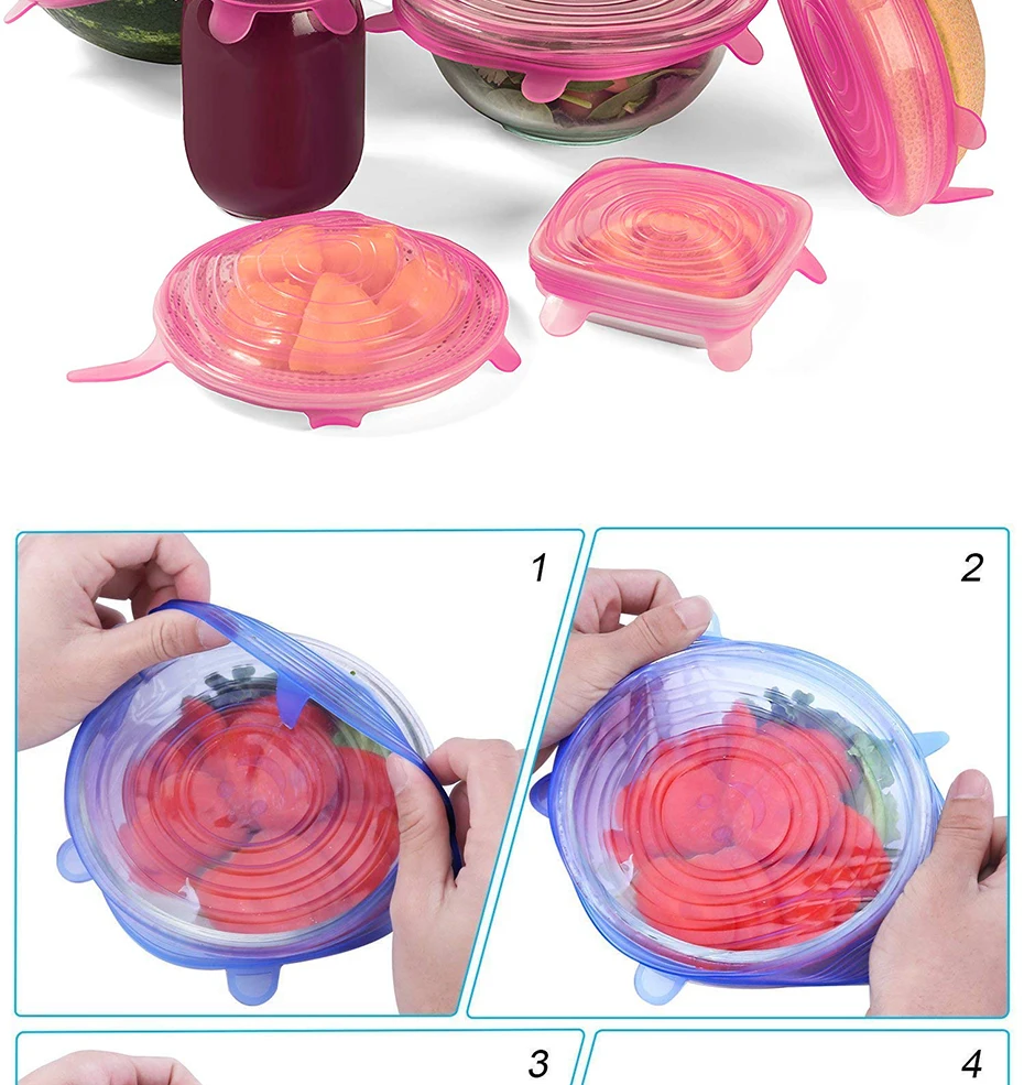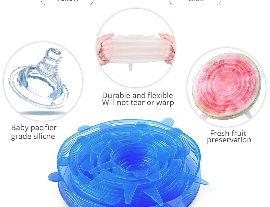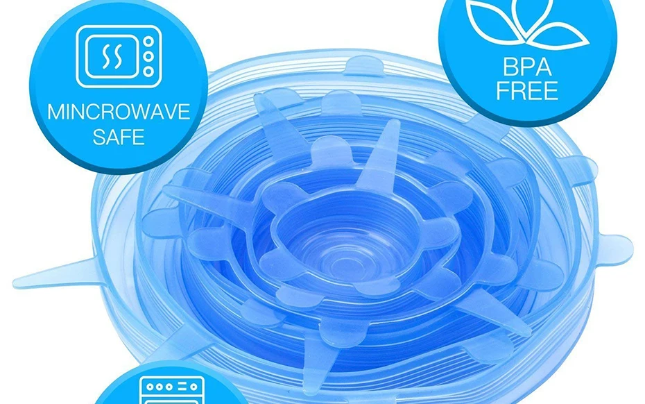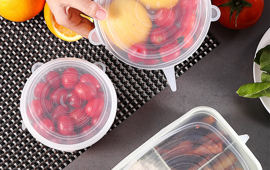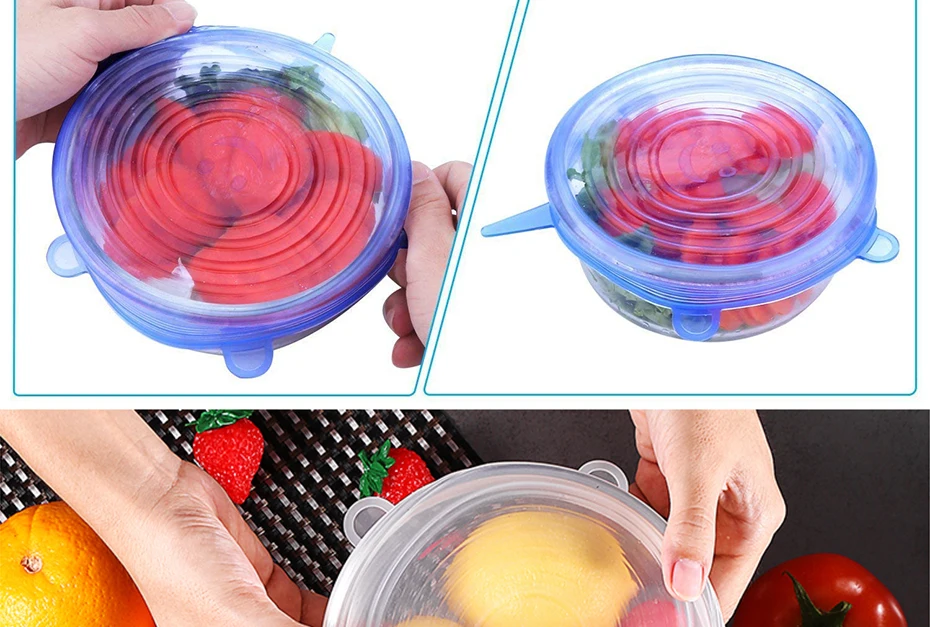 6 размеров в одном наборе, продукт обладает хорошей эластичностью и может растягиваться, чтобы покрыть различные формы и размеры фруктов, овощей и чаш,