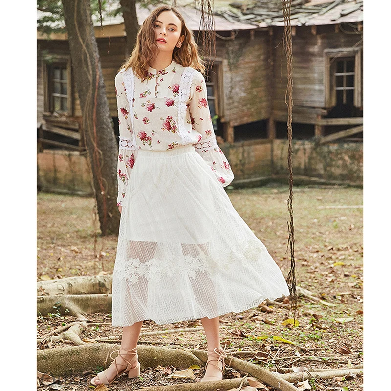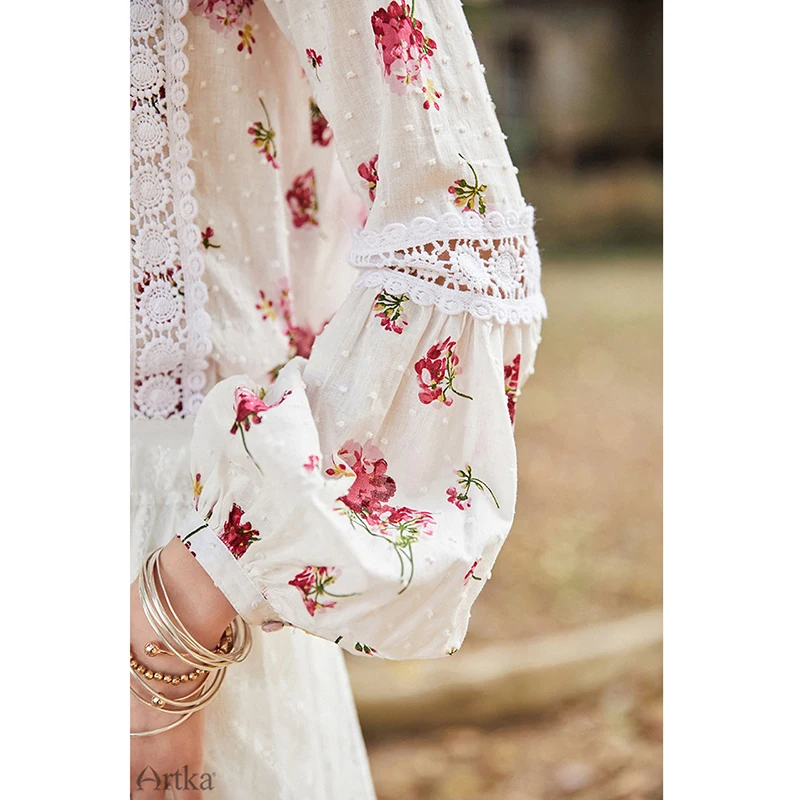 Женская ажурная рубашка с вышивкой ARTKA, белая блузка с рукавами-фонариками, воротником-стойкой и кружевным принтом, SA10787C, на лето 2018