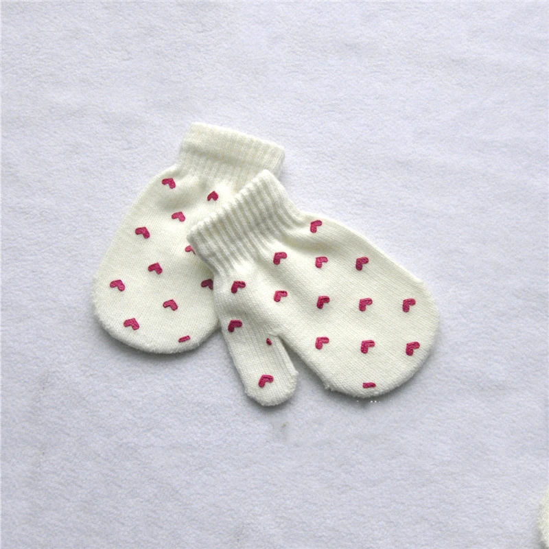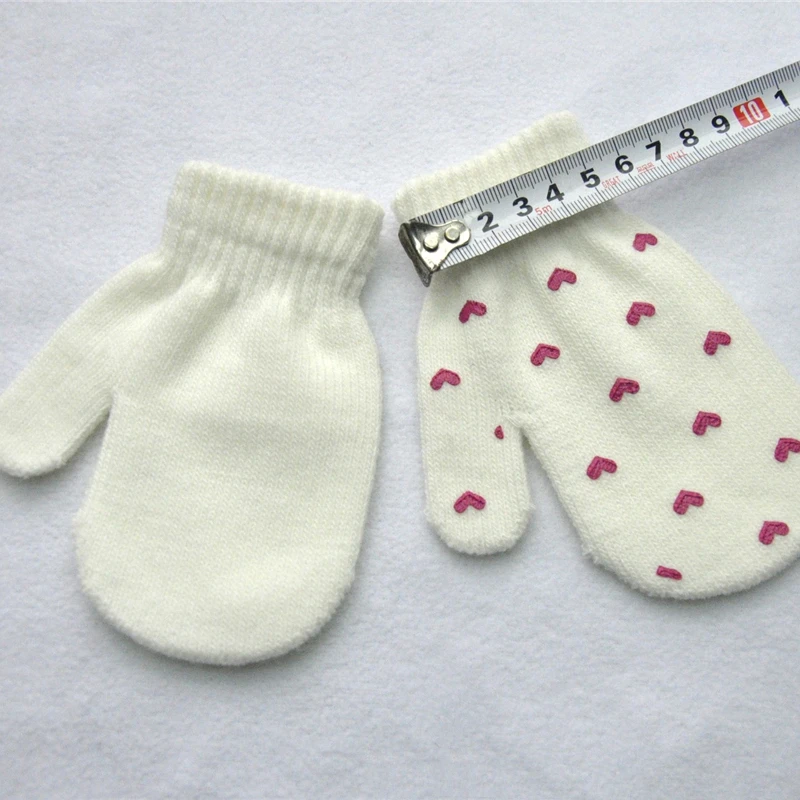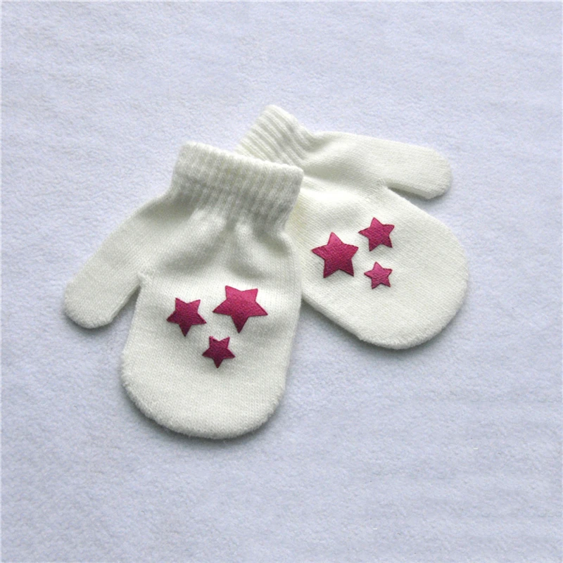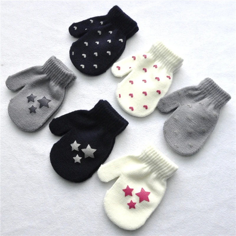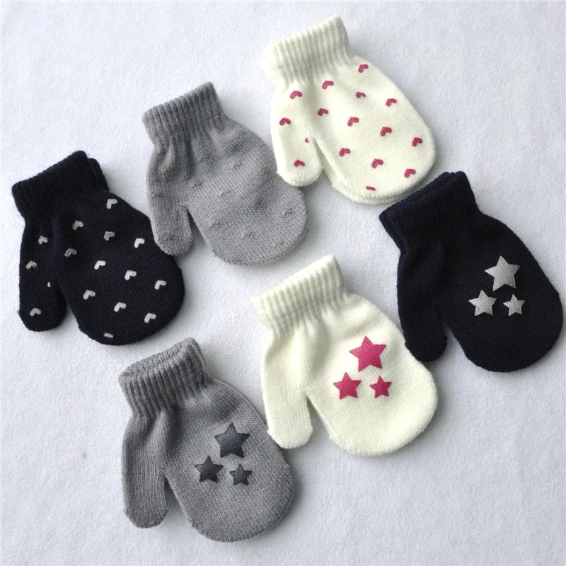 Милые зимние перчатки для мальчиков и девочек, теплые вязаные перчатки для младенцев, детские перчатки с пальцами, однотонные перчатки с принтом звезд и сердец для детей 0-12 месяцев