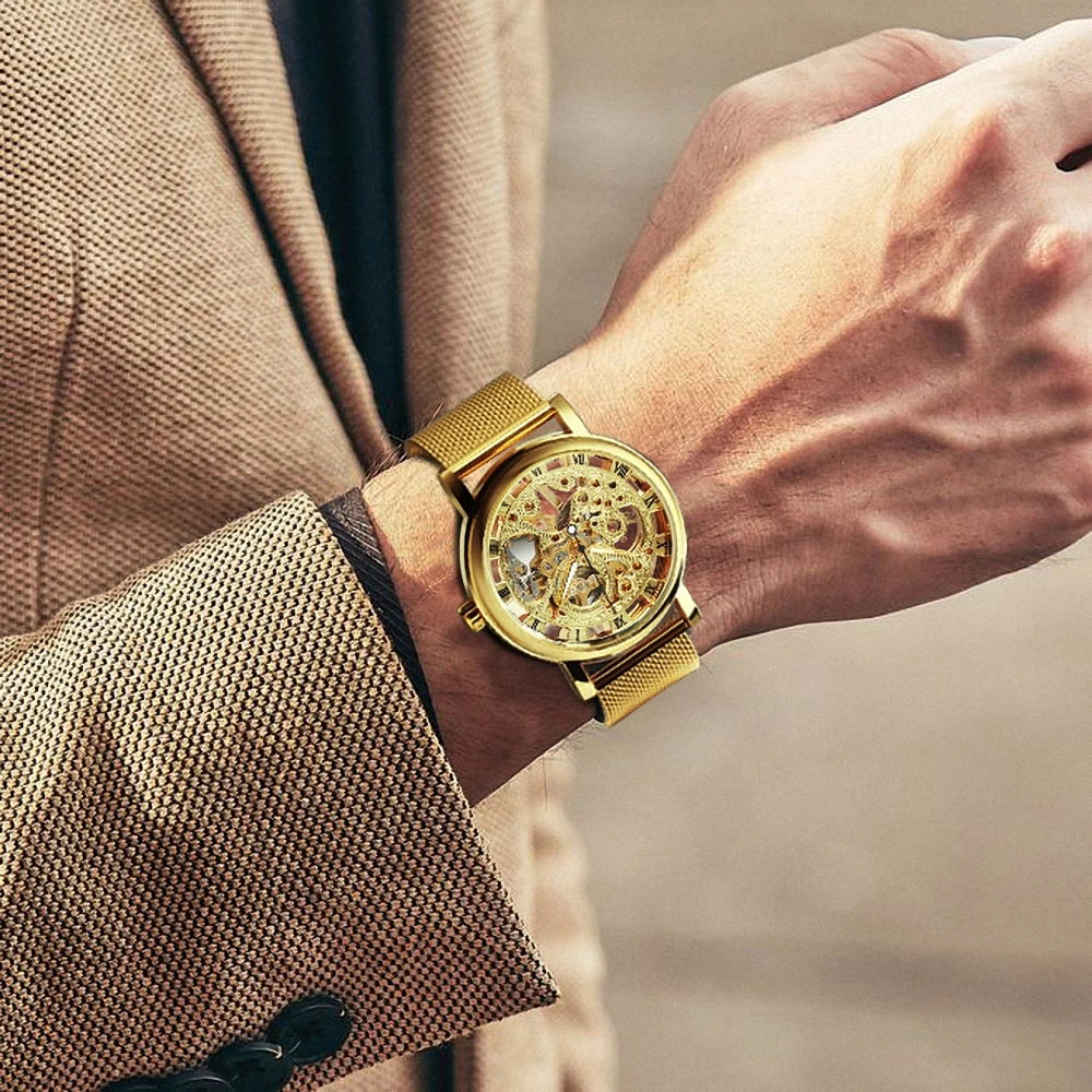 Механические часы WINNER, мужские, ультратонкие, с золотистым сетчатым ремешком, Классические Механические наручные часы унисекс