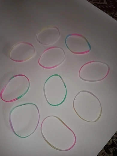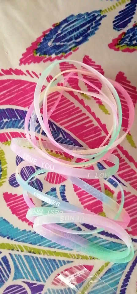 В упаковке 10 тонких силикововых браслетика с надписями "friends forever", "friendship", "love" и "I miss you". на ручку 6-летнего ребенка нормально. В темноте немножко светятся. В садике почти все раздали как браслеты дружбы)