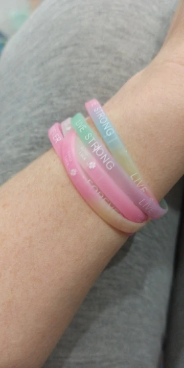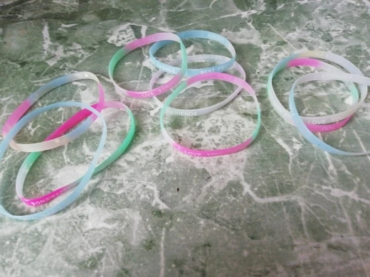 Светятся в темноте.Нежных цветов,с надписями .Силиконовые.Могут служить резинкой для волос.