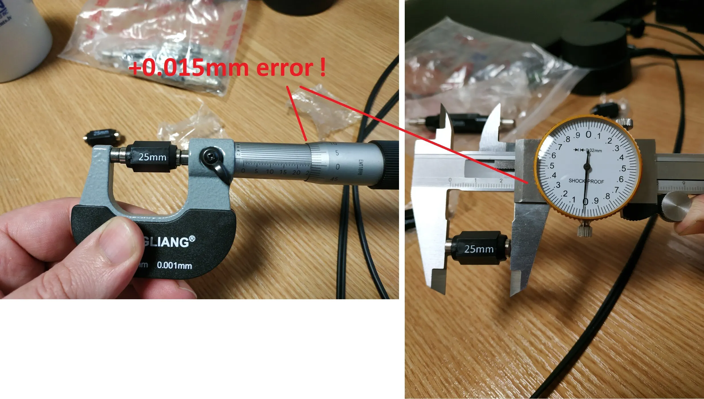 Возьмите два размера 25 мм: 25 мм (а)-погрешность около + 0,022 мм или + 2200%! 25 мм (b) -погрешность около + 0,015 мм или + 1500%! Ни одна балка не находится внутри +/-0,001 мм точности, как обещано, они даже не В +/-0,01 мм точности! Они бесполезны для калибровки без повторного шлифования! Мусор для скрапа! Продавец игнорировал сообщения, не сотрудничал. После того, как продавец солгал судье о споре, что измерительные балки могут быть измерены только цифровыми штангами! Что за обманчивый негодяй! Я настоятельно не рекомендую ни продукт, ни обман, лжи продавцу!