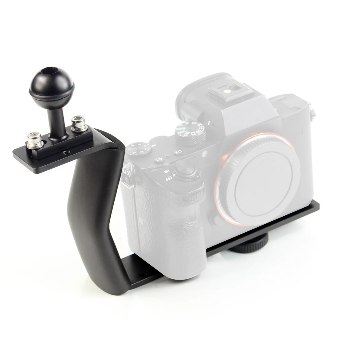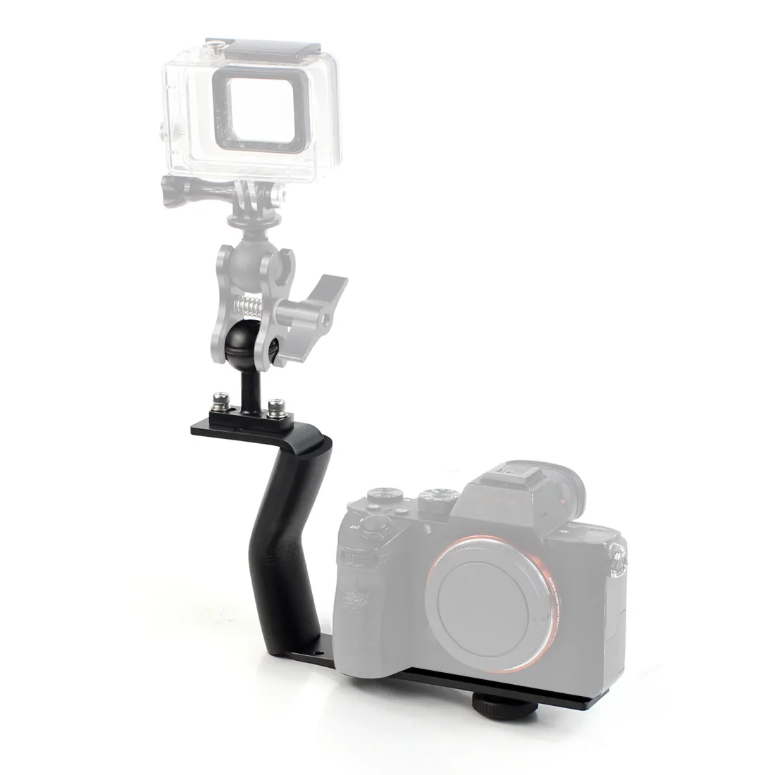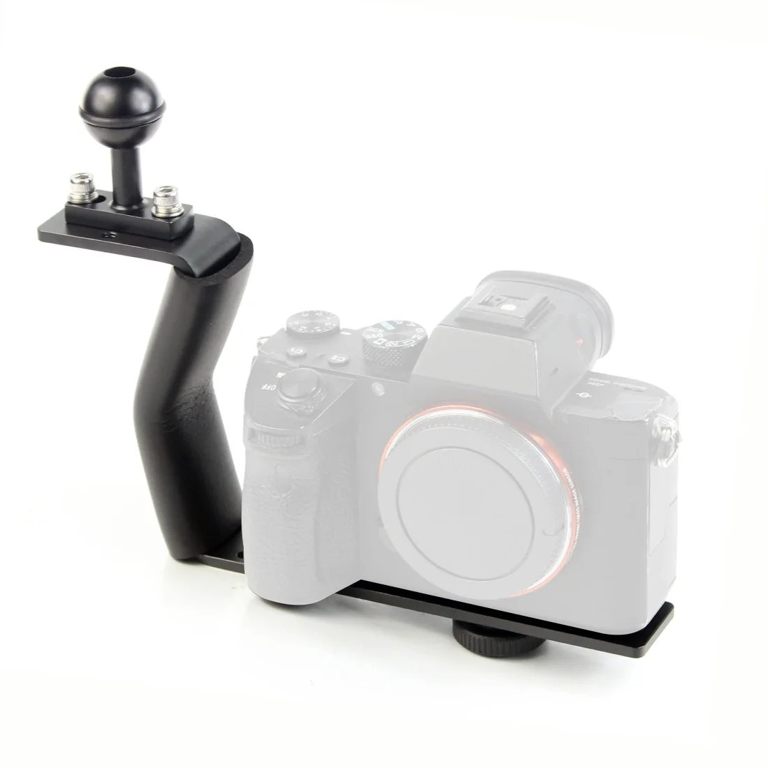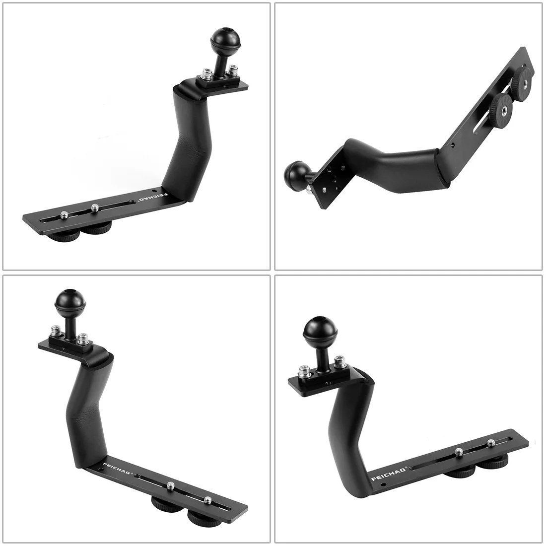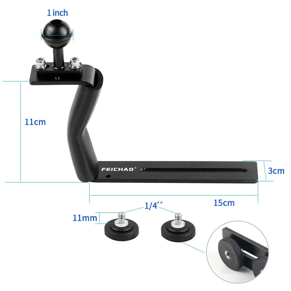 Универсальная зеркальная цифровая камера для подводной фотосъемки с регулируемым опорным лотком с шаровой головкой и ручкой.Материал: алюминиевый сплав.Дно Длина: 15 см/5,91 дюймов; Высота каблука: 11 см/4,33 дюймов; Ширина: 3 см/1,18 дюймов.Может использоваться в качестве кронштейна для камер, с расширенным дизайном нижнего лотка, также может использоваться в качестве ручки для больших зеркальных камер.Слот для лотка имеет два регулируемых винта 1/4, легко устанавливается и очень стабильно.