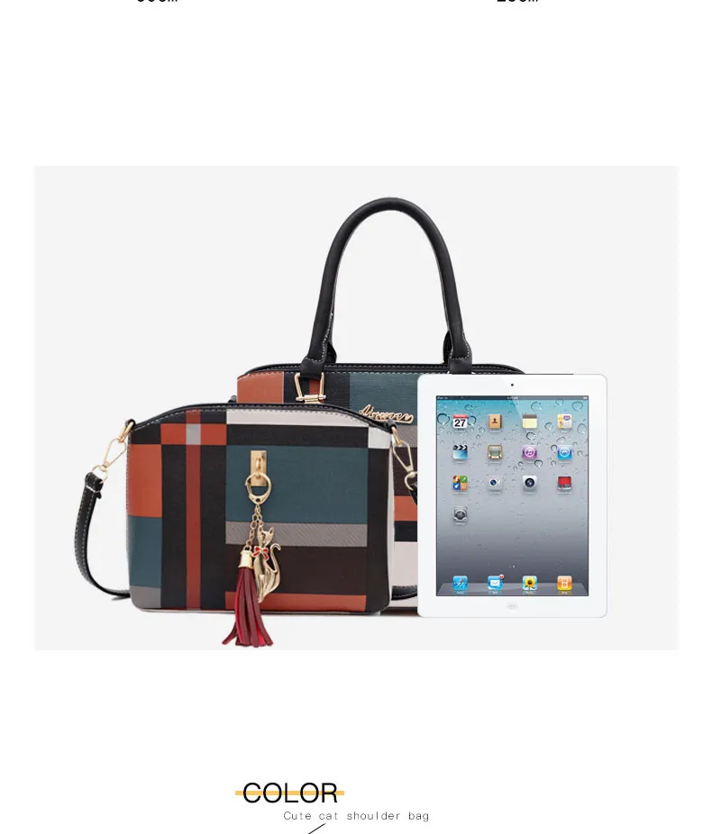 Сумки заказала 27.11.2020, получила посылку 08.02.2021. Спасибо за упаковку товара, в большую сумку были положены маленькие сумочки, внутри ещё были пакетики с воздухом. Висюлька с котиком одна на три сумки. Сумочки в клеточку симпотичные без диффектов. Синяя сумочку через плечо немного помятая, небыло висюльки. А так неплохие сумки, посмотрим как будут носиться.