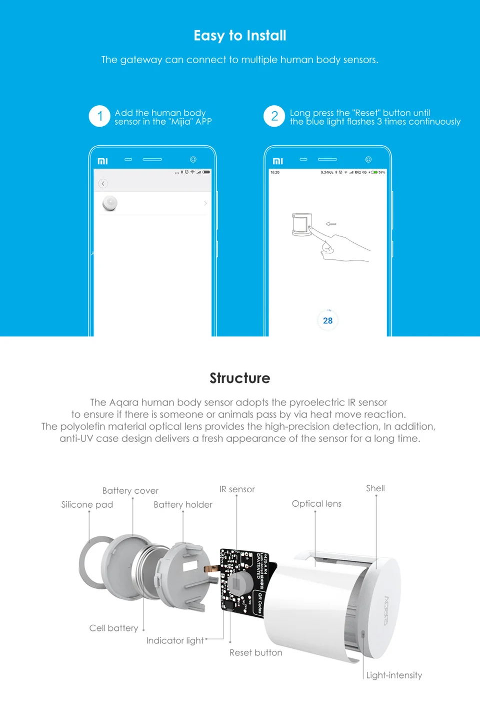 Датчик человеческого тела Xiaomi Aqara PIR, смарт-датчик движения, датчик безопасности, Wi-Fi, беспроводное соединение ZigBee, шлюз, концентратор, приложение Mi Home