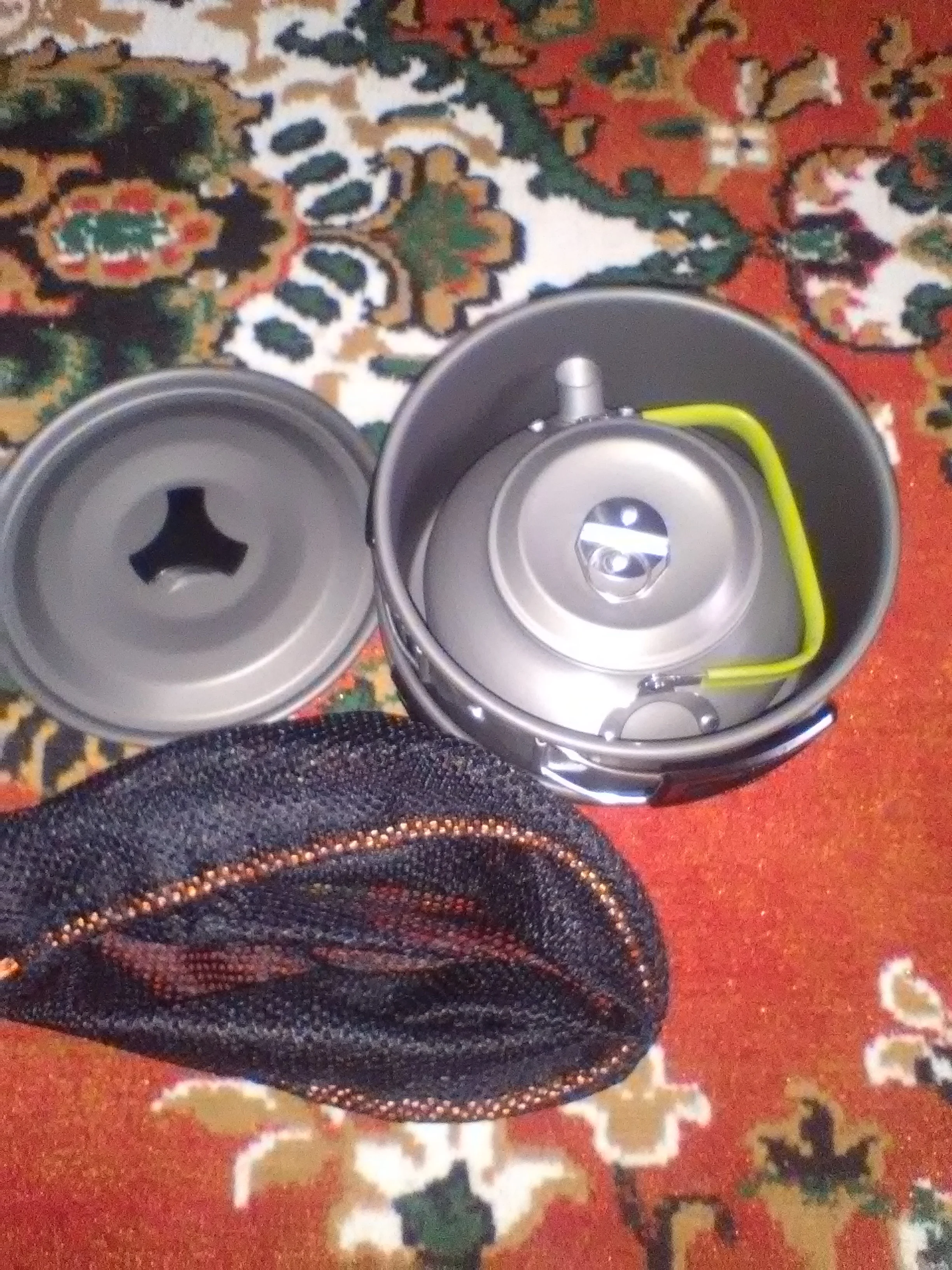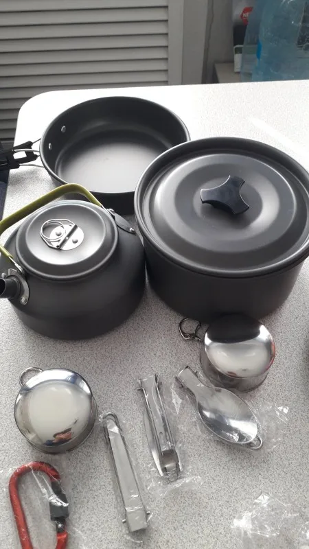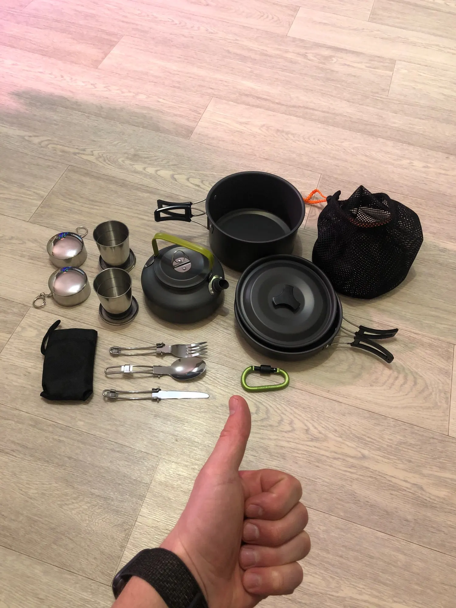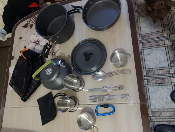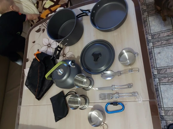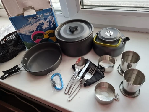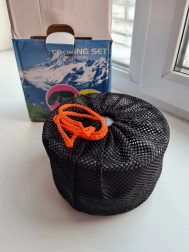 Отличный продукт. Очень нравится он компактность товаров. Они изготовлены из хорошего материала. Очень полезно и легко носить с собой. В комплекте с кастрюлей, двумя складными чашками, 1 набор столовых приборов, 1 карабин, 1 кастрюля, 1 чайник и сумка для переноски.