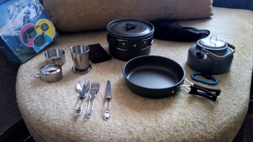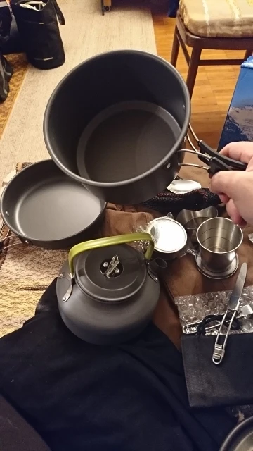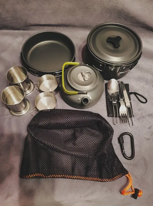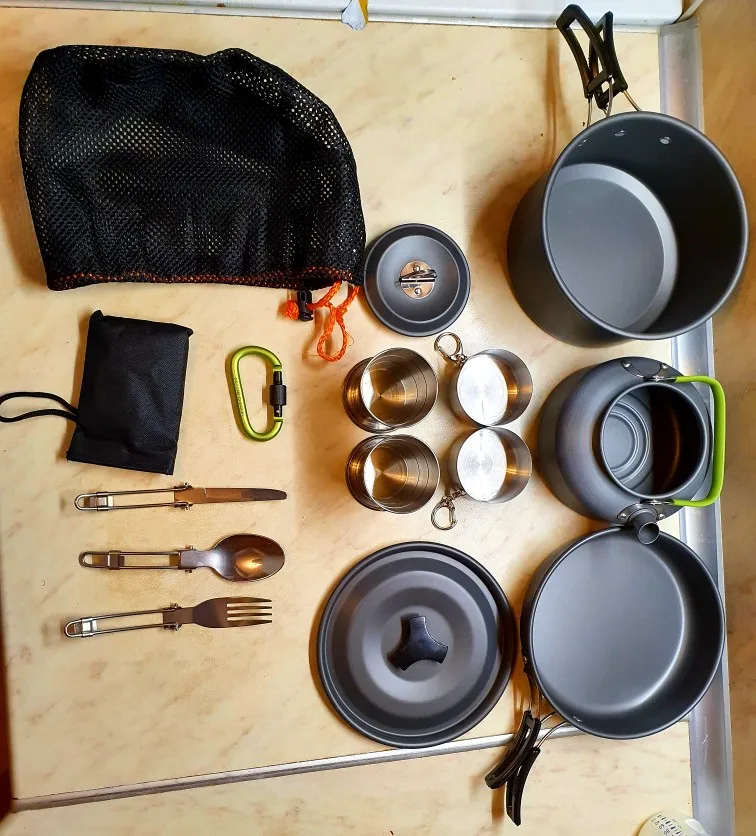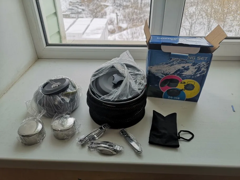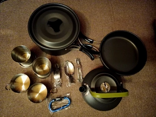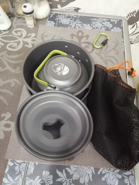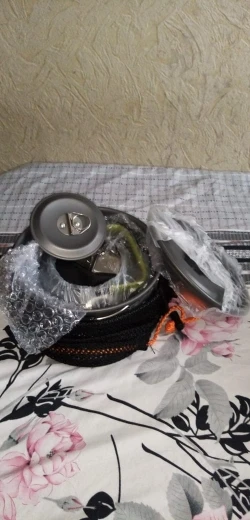 Отличный продукт. Очень нравится он компактность товаров. Они изготовлены из хорошего материала. Очень полезно и легко носить с собой. В комплекте с кастрюлей, двумя складными чашками, 1 набор столовых приборов, 1 карабин, 1 кастрюля, 1 чайник и сумка для переноски.