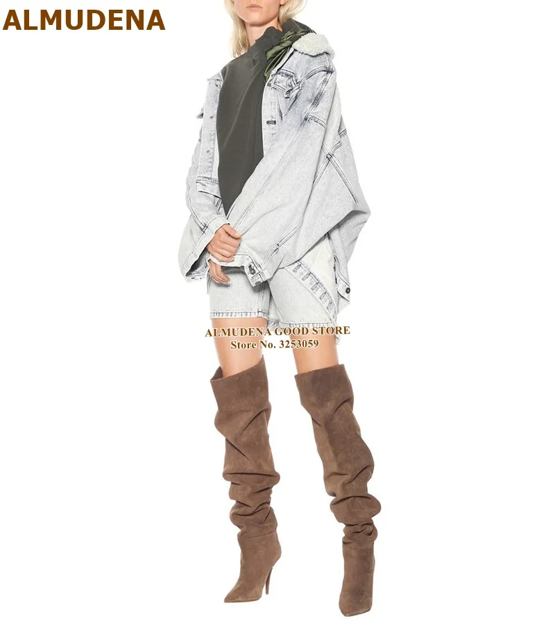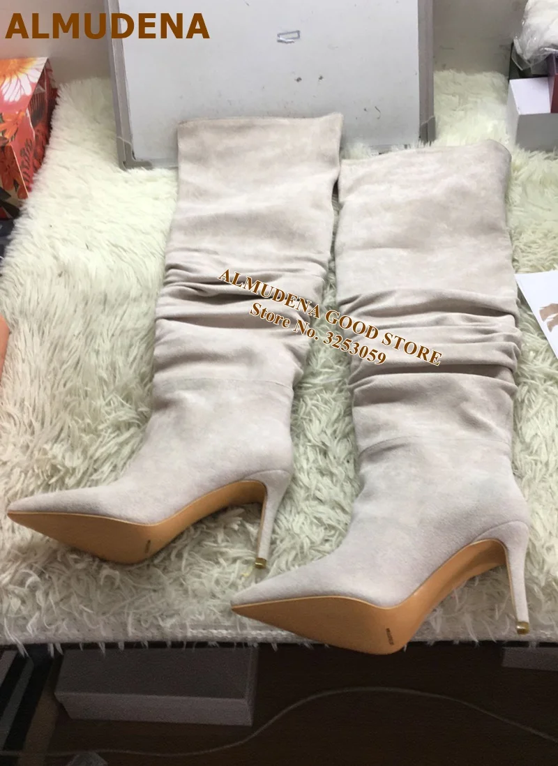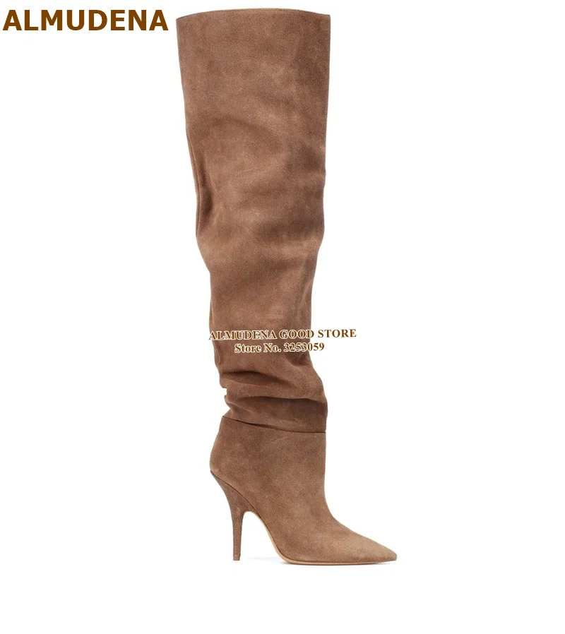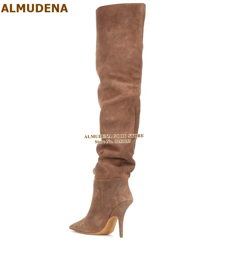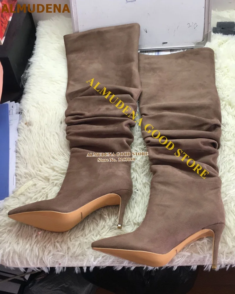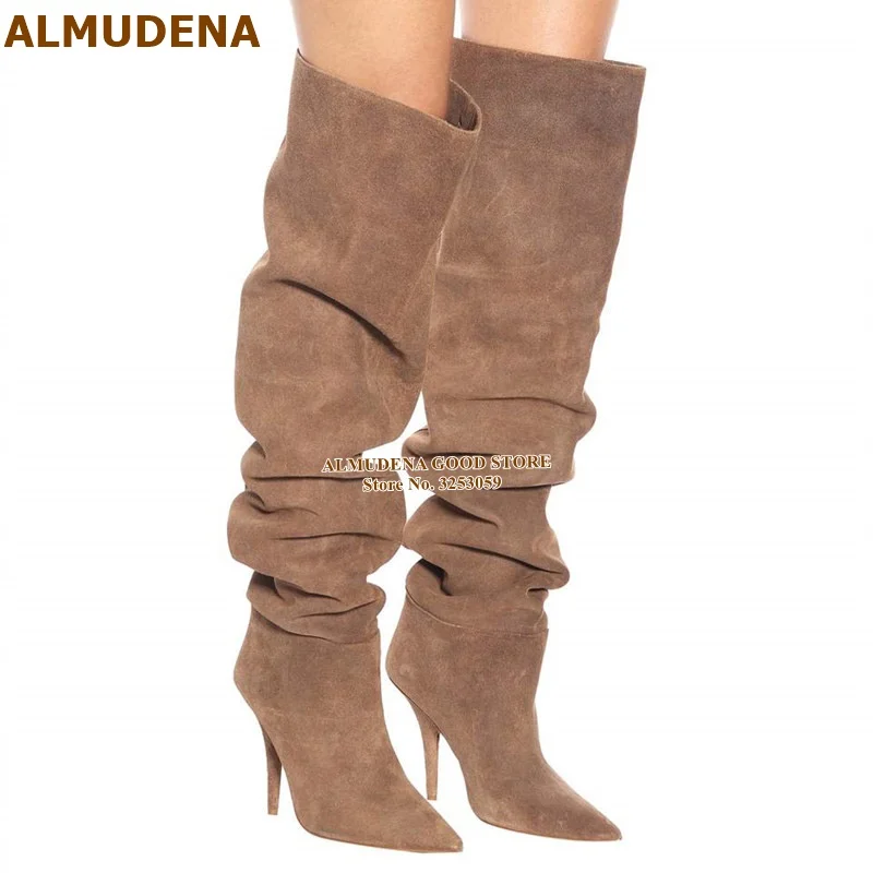 Плиссированные Сапоги выше колена ALMUDENA, кофейные замшевые свободные сапоги до бедра с острым носком, Классическая обувь на шпильке, размер 46, длинные сапоги, обувь