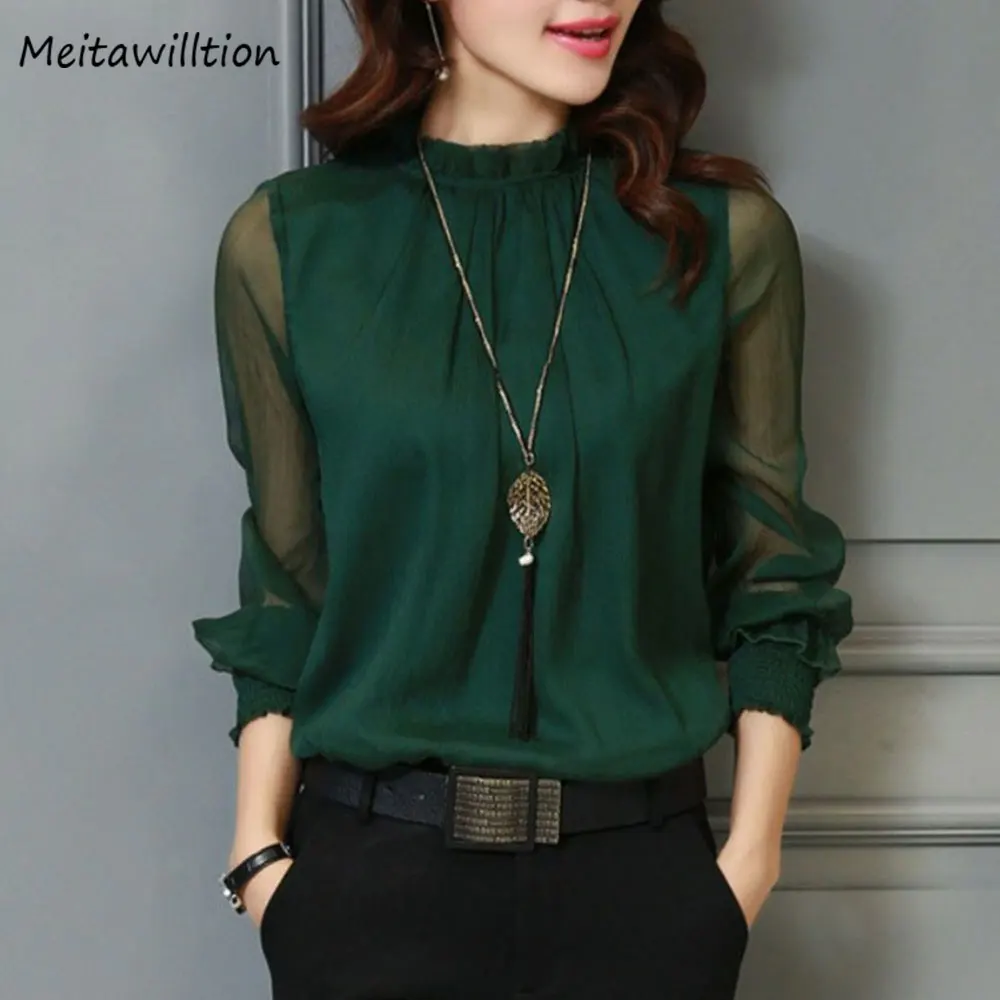 Женская шифоновая блузка, с длинным рукавом и круглым вырезом, прозрачная, свободная, весна-осень 2020