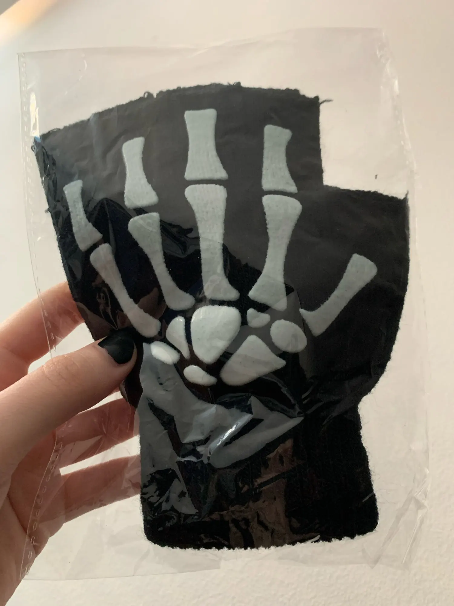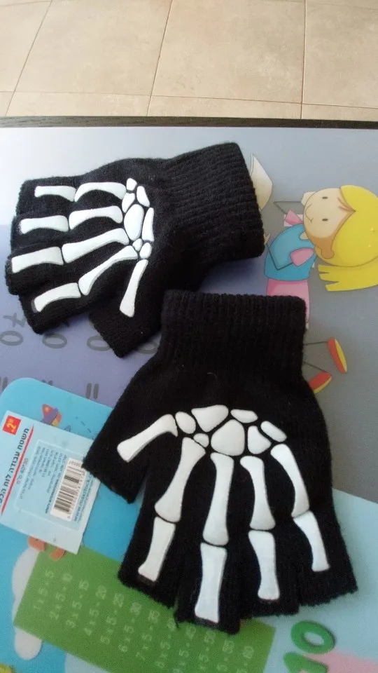 Мегакрутые перчатки! кстати, их можно надевать в магазинах, где требуют маску и перчатки и к вам не будут придираться. В некоторых частях вылезают ниточки, но это не страшно. А еще рисунок костей светится в темноте. За свою цену (~40 рублей) просто отлично!