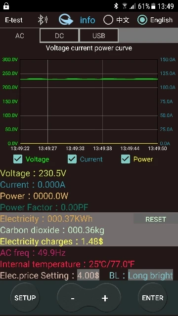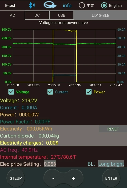 Тестер пришел в центрально-черноземный район за две с небольшим недели в целости и сохранности, упакован в "пупырку". Все соответствует описанию. Приложение на андроид "E-test" скачал на плэймаркете. Сопряжение по Bluetooth приложения с устройством происходит не быстро, в списке видимости возникает не сразу, так что наберитесь терпения. В приложении отображаются графики напряжения, силы тока и потреб-мой мощности, только градации мощности не обнаружил. Пишутся логи всех параметров посекундно в таблицу Excell и по нажатию кнопки сохраняются в память смартфона в папку "Etest". В целом, устройство оправдало ожидания, в хозяйстве пригодится.