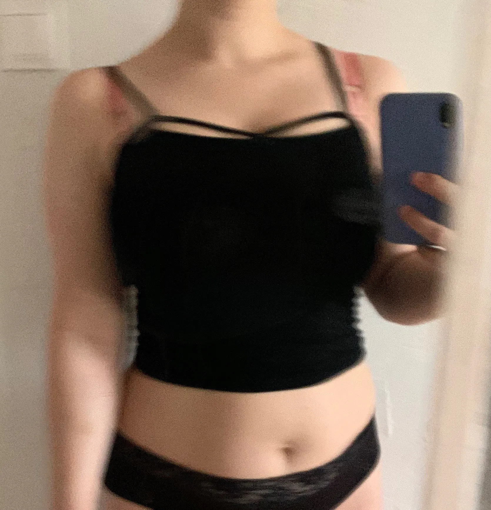 Майка длиной чуть ниже талии мне, заказывала на ог 94 и от 74, удивительно, но влезла, хотя чашки оказались выше груди и их пришлось вытащить. Майка очень просвечивает, этой подкладки на мою грудь не хватает, но я ее взяла носить под что-нибудь, поэтому не критично.