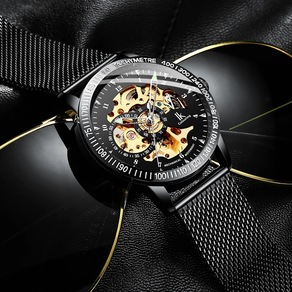 Часы наручные IK Мужские механические Автоматические, плетеный браслет из нержавеющей стали, с сетчатым браслетом, в стиле стимпанк, часы-скелетоны