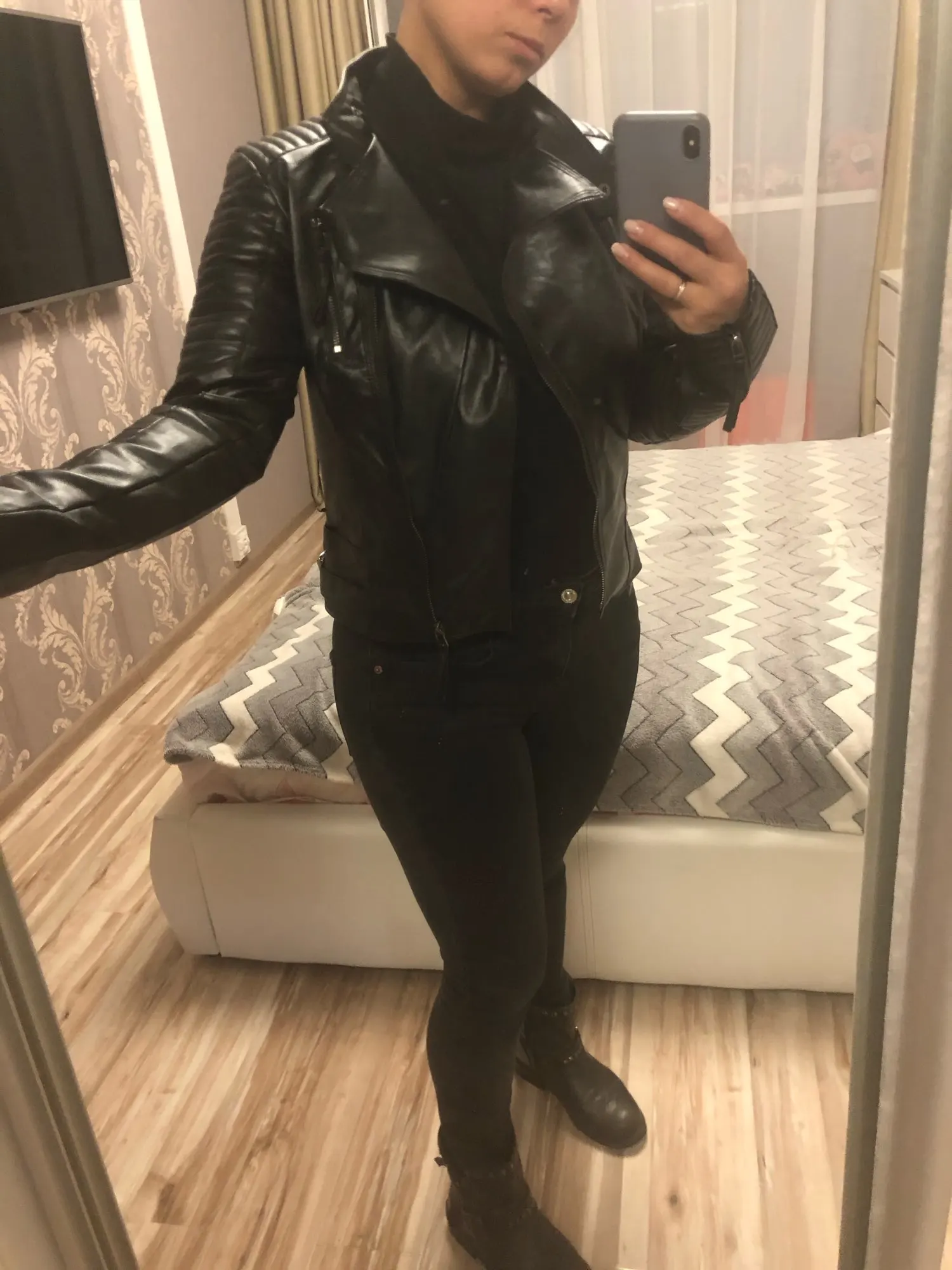 Спасибо продавцу за качество и быструю доставку. У куртки очень хороший крой. Сидит идеально, если правильный размер. Маломерит. Я ношу S, но заказала L. Не прогадала. Идеально. Мои параметры: рост 171, вес 57, ог 86, об 69. Длина, посадка в плечах, рукава – всё идеально.