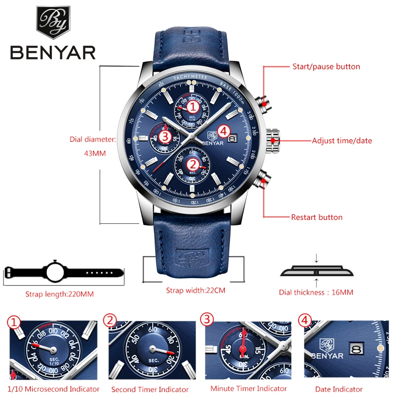 Часы BENYAR Мужские кварцевые с хронографом, люксовые брендовые модные спортивные автоматические с датой и кожаным ремешком, 2022