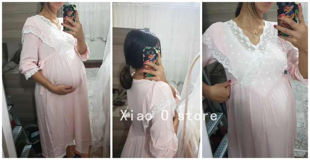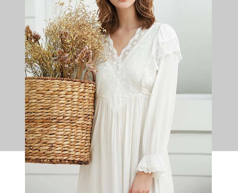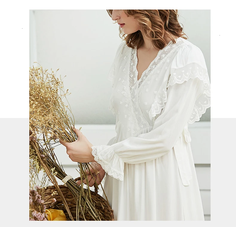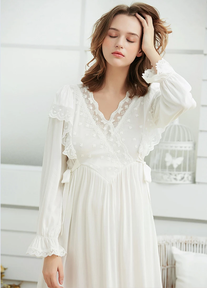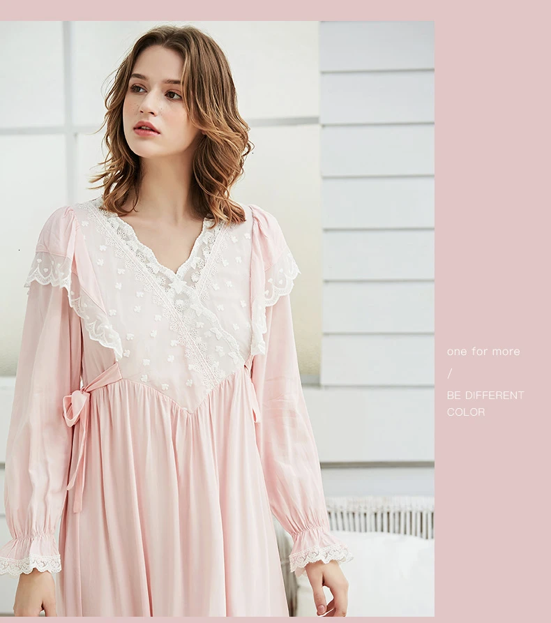 Ночная рубашка для дам, винтажная кружевная хлопковая ночная рубашка, элегантная белая ночная рубашка для женщин, ночная сорочка с длинным рукавом, розовая женская ночная рубашка
