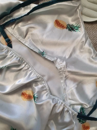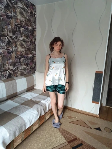 Красивая пижама, все в комплекте. Пришла быстро, за 2 недели. Не очень удобная майка, чашечки слишком высоковаты, я их достала, но шов всё равно трёт, аж раздражение пошло. Ткань сильно мнётся и электризуется, к ней всё липнет.
