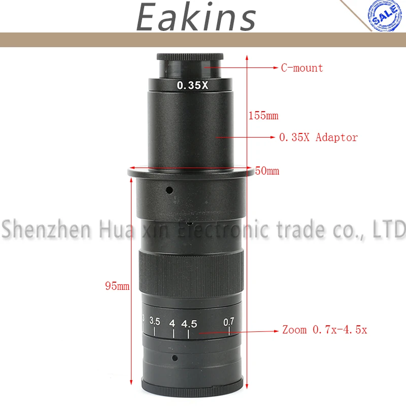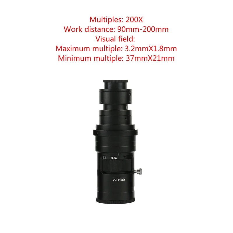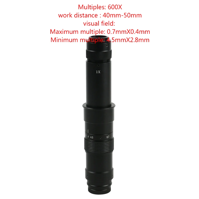 8X-100X Zoom C-mount Lens:Рабочее расстояние: 40 мм-400 ммКоэффициент масштабирования: 1:17Увеличение мощности на 0,12-2X (около 8X - 100X на мониторе)Поле обзора макс. кратное: 5,4 мм * 3 ммМногократное поле обзора: 54 мм * 3 ммРазмер: 115 мм (L) * 40 мм (DIA)Вес: 210 г10X-120X C-MOUNT Объектив:Рабочее расстояние: 90-180 ммКоэффициенты масштабирования: 1:6.5Увеличение мощности на 0,7-X (около 10-X на дисплее)Поле обзора макс. кратное: 4 мм * 2,2 ммМногократное поле обзора: 40 мм * 22 ммЛинза окуляра: 0,35xРазмер: 155 мм (L) * 50 мм (DIA)Вес: 570 г10X-180X C-MOUNT Объектив:Рабочее расстояние: 100-150 ммКоэффициенты масштабирования: 1:6.5Увеличение мощности на 0,7-X (около 15-X на дисплее)Поле обзора макс. кратное: 2,8 мм * 1,5 ммМногократное поле обзора: 25 мм * 14 ммЛинза окуляра: 0,5 хРазмер: 168 мм (L) * 50 мм (DIA)Вес: 600 гОбъектив 20X-300X C-MOUNT:Рабочее расстояние: 90-100 ммКоэффициенты масштабирования: 1:6.5Увеличение мощности на 0,7-X (около 20-X на дисплее)Поле обзора макс. кратное: 1,4 мм * 0,8 ммМногократное поле обзора: 10 мм * 5 ммЛинзы окуляра: 1XРазмер: 245 мм (L) * 50 мм (DIA)Вес: 630 г10X-130X C-MOUNT Объектив:Рабочее расстояние: 60 мм-300 ммКоэффициенты масштабирования: 1 : 11Увеличение мощности на 0,1-X (около 10-X на дисплее)Поле обзора макс. кратное: 8 мм * 4,5 ммМногократное поле обзора: 40 мм * 33 ммРазмер: 30 мм (диаметр) * 84 мм (длина)Вес: 180 г1X-130X C-MOUNT Объектив:Рабочее расстояние: 50 мм-1000 ммКоэффициенты масштабирования: 1 : 15Увеличение мощности на 0,13-2X (около 1 - 130X на дисплее)Поле обзора макс. кратное: 4,2 мм * 2,4 ммМногократное поле обзора: 130 мм * 70 ммРазмер: 30 мм (диаметр) * 99 мм (длина)Вес: 195 г10X-200X C-mount Объектив:Рабочее расстояние: 90 мм-200 ммКоэффициенты масштабирования: 1: 7,2Увеличение мощности на 0,7-5X (около 10 - 200X на дисплее)Поле обзора макс. кратное: 3,2 мм * 1,8 ммМногократное поле обзора: 37 мм * 21 ммЛинза окуляра: 0.4XРазмер: 55 мм (диаметр) * 132 мм (длина)Вес: 455 г25X-500X C-mount Lens:Рабочее расстояние: 90 мм-100 ммКоэффициенты масштабирования: 1: 7,2Увеличение мощности на 0,7-5X (около 25 - 500X на дисплее)Поле обзора макс. кратное: 1,3 мм * 0,7 ммМногократное поле обзора: 9 мм * 5 ммЛинзы окуляра: 1XРазмер: 55 мм (диаметр) * 175 мм (длина)Вес: 510 г30X-360X с-образный Объектив:Рабочее расстояние: 40 мм-50 ммКоэффициенты масштабирования: 1: 6,5Увеличение мощности на 0,7-X (около 30 - 360X на дисплее)Поле обзора макс. кратное: 1,4 мм * 0,8 ммМногократное поле обзора: 9 мм * 5 ммЛинза окуляра: 0,5 хОбъектив: 2XРазмер: 42 мм (диаметр) * 182 мм (длина)Вес: 380 г60X-600X C-mount Объектив:Рабочее расстояние: 40 мм-50 ммКоэффициенты масштабирования: 1: 6,5Увеличение мощности на 0,7-X (около 30 - 360X на дисплее)Поле обзора макс. кратное: 0,7 мм * 0,4 ммМногократное поле обзора: 4,5 мм * 2,8 ммЛинзы окуляра: 1XОбъектив: 2XРазмер: 42 мм (диаметр) * 182 мм (длина)Вес: 380 г16X-160X c-mount объективРабочее расстояние: 210 мм-1000 ммУвеличение мощности на 0,7-5XКоэффициенты масштабирования: 1: 7,2Около 16 - 160X на 21-дюймовом ЖК-дисплее (на 1/2, 5 дюймов цдд)Поле обзора макс. кратное: 6,3 мм * 3,5 ммМногократное поле обзора: 140 мм * 80 ммЛинза окуляра: 0.4XОбъектив: WD210 0.5XРазмер: 59 мм (диаметр) * 166 мм (длина)Вес: 380 г32X-320X c-mount объективРабочее расстояние: 105 мм-220 ммУвеличение мощности на 0,7-5XКоэффициенты масштабирования: 1: 7,2Около 32 - 320X на 21-дюймовом ЖК-дисплее (на 1/2, 5 дюймов цдд)Поле обзора макс. кратное: 3 мм * 1,7 ммМногократное поле обзора: 35 мм * 20 ммЛинза окуляра: 0.4XОбъектив: WD105 1XРазмер: 59 мм (диаметр) * 166 мм (длина)Вес: 380 г Обратите внимание, что все данные тестирования основаны на камере микроскопа Eakins 37MP 1080P. Если вы используете другие камеры, данные будут смеще