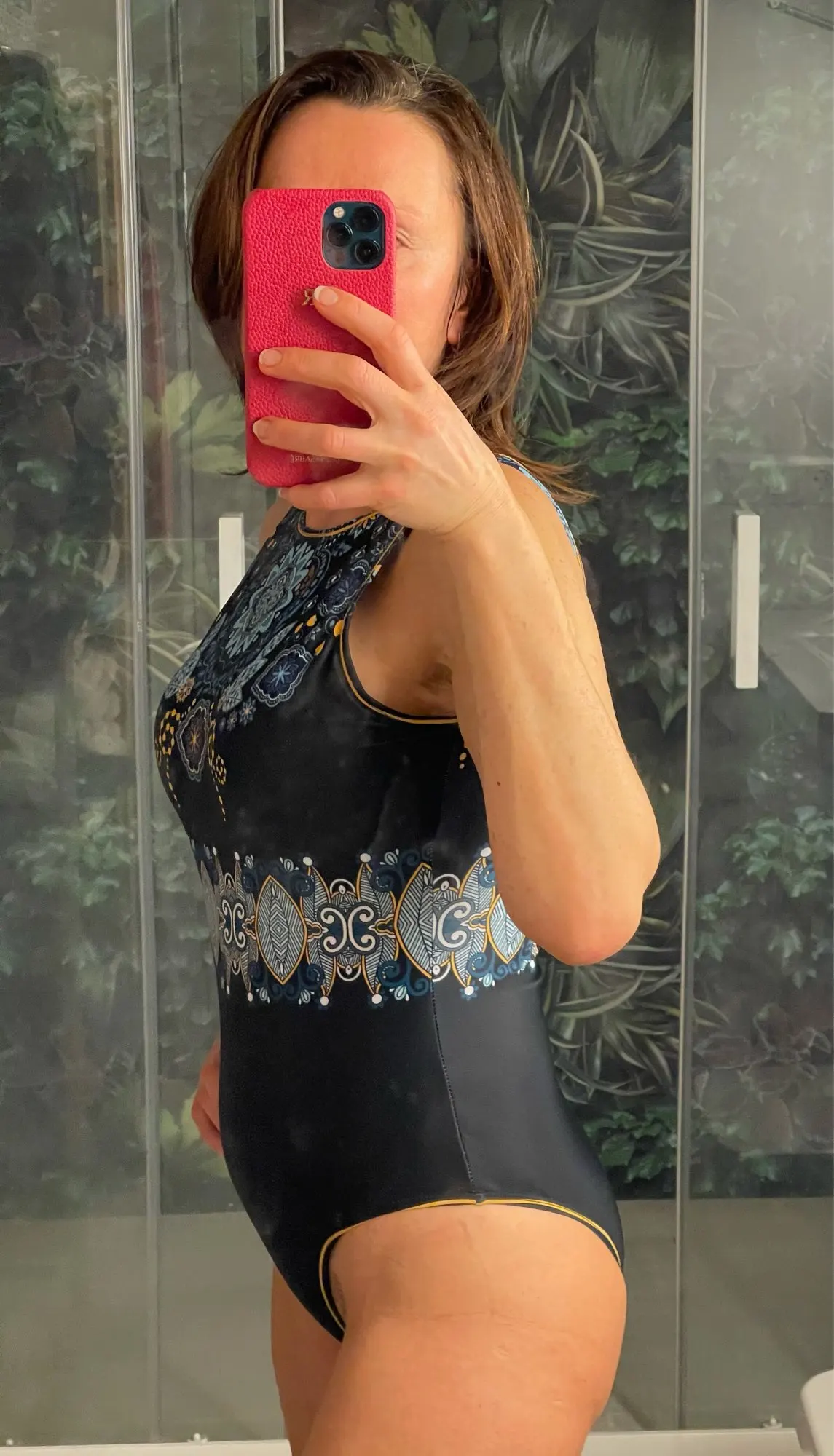 Купальник как на фото, немного не угадала с размером, буду переживать, горловина очень высоко
